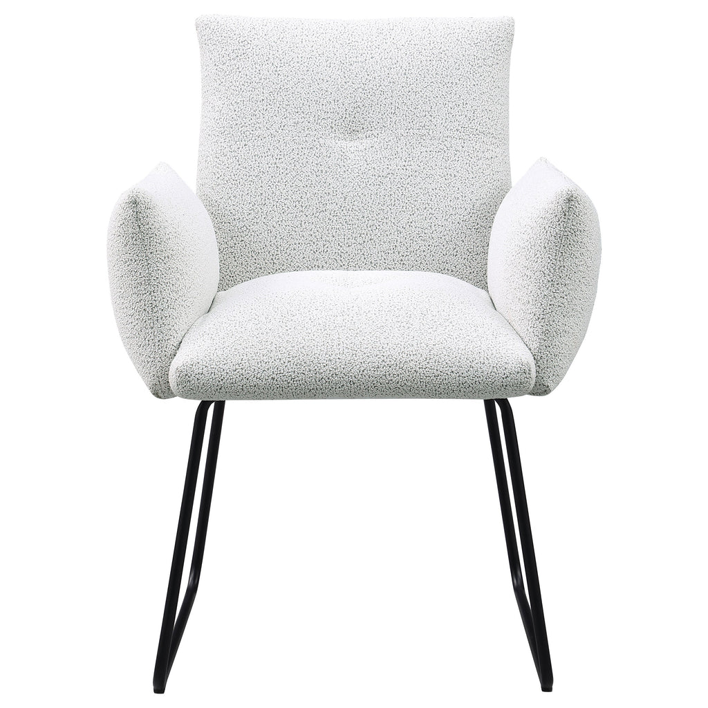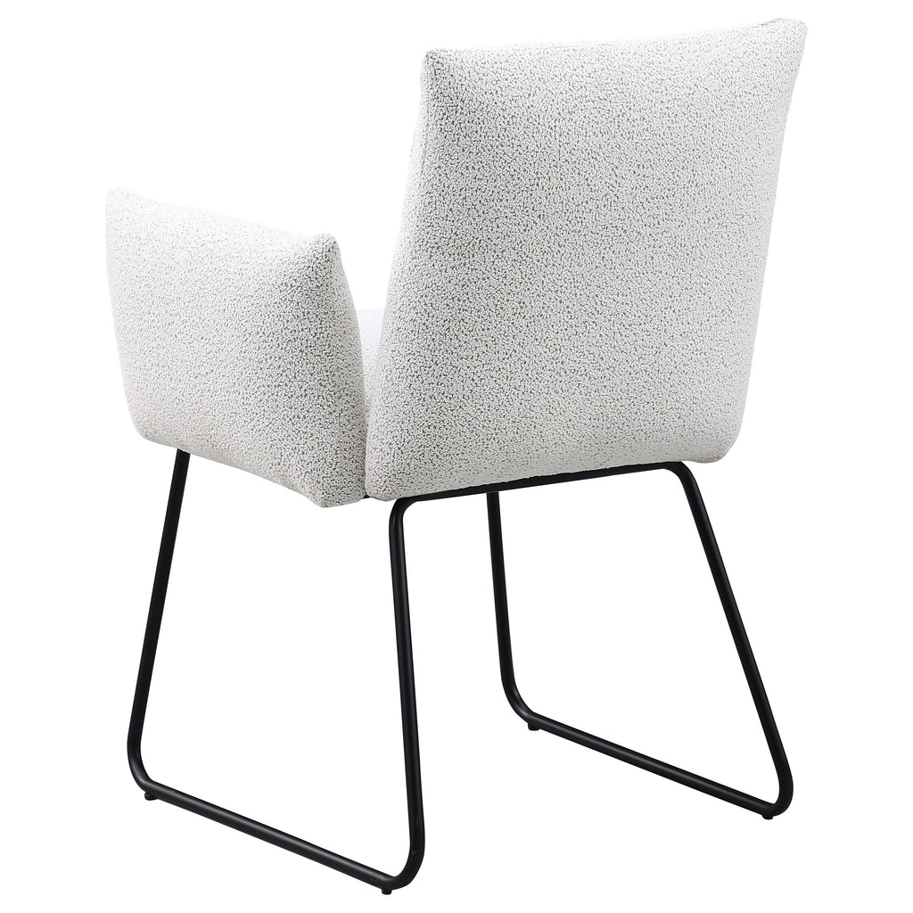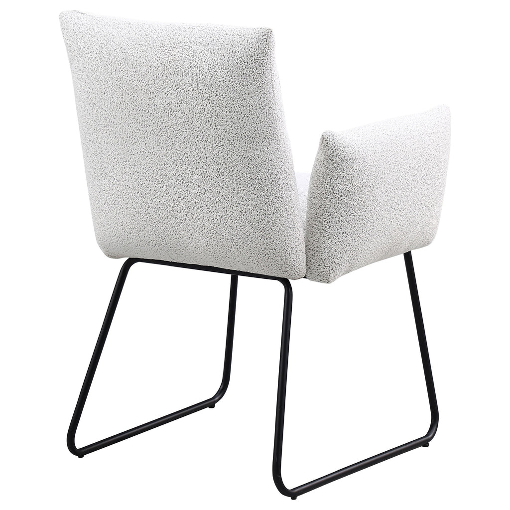Elevate your dining experience with this modern dining chair, designed for both comfort and style. Upholstered in soft fabric, this chair provides a cozy seat for everyday dining or special gatherings. The chair features a contemporary design with gently curved armrests and a sleek, powder-coated black metal sled base for a minimalist yet bold look. Its clean lines and subtle elegance make it a perfect addition to any modern dining room or kitchen space.