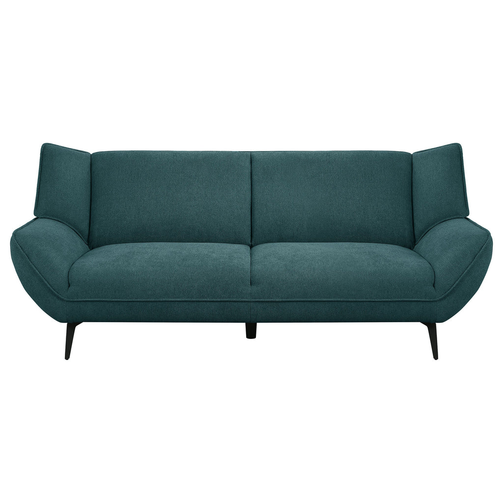Bring the best of mid-century modern style to your casual space with this sofa set that inspires. This comfy and stylish teal blue set is a great choice for outfitting a living room or family room. Gorgeous fabric upholstery opens up possibilities for a lush palette choice. Flared arms and wing backs attach to non-removable seat and back cushions. Tapered black metal legs coordinate with the beautiful teal blue upholstery.