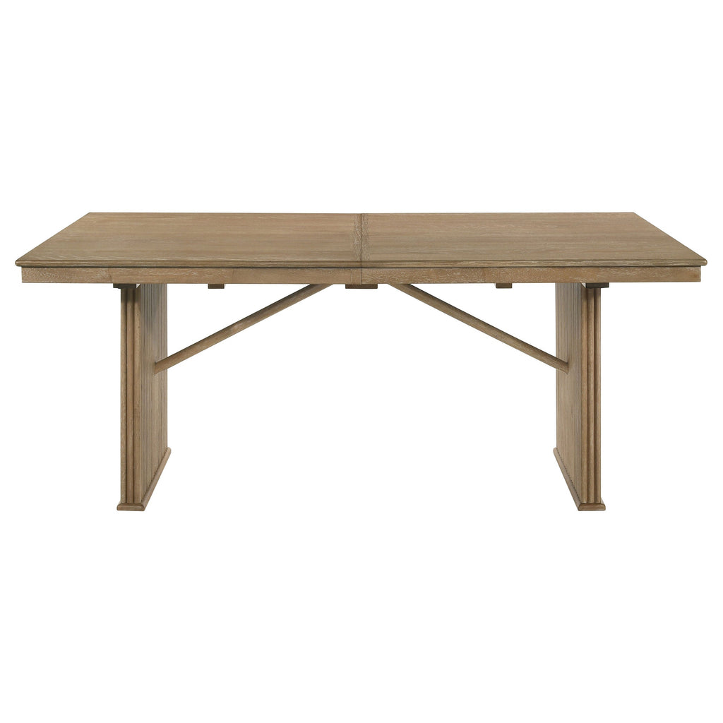 This dining table in a pearly almond finish combines modern elegance with natural textures. Crafted from oak veneer, Asian hardwood, and engineered wood, the table boasts a sturdy and stylish design. The base features striking vertical reeding side panels that add a touch of texture and visual interest. Designed for both intimate meals and larger gatherings, the table includes an extension leaf for versatile seating. Its clean lines and unique base make it a perfect centerpiece for contemporary dining spaces.