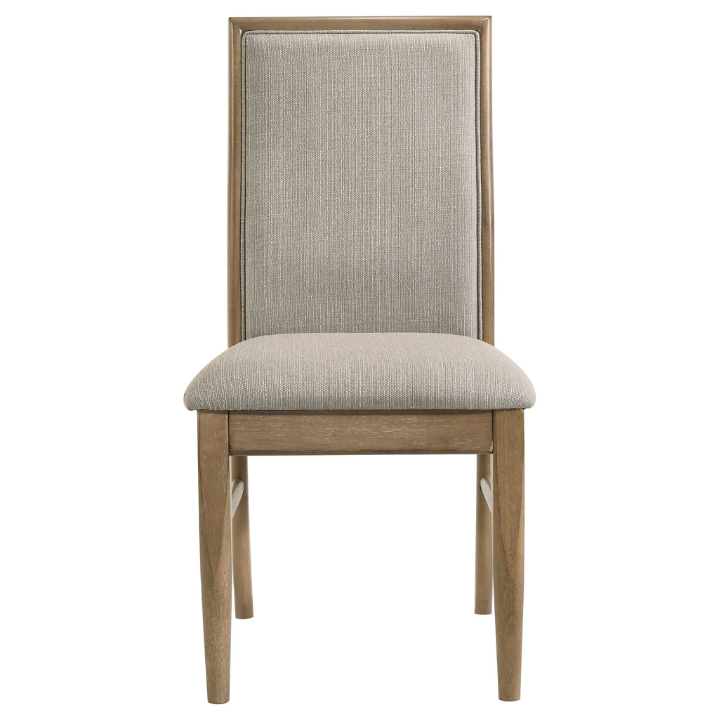 This dining chair combines a refined pearly almond finish with the comfort of warm wheat fabric upholstery. Crafted from Asian hardwood, engineered wood, and foam, the chair provides both durability and style. The ergonomic backrest offers excellent support, ensuring a comfortable dining experience. Upholstered in soft, linen-like wheat fabric, the seat and backrest add a cozy yet elegant touch. This versatile chair pairs beautifully with modern and transitional dining tables, making it a functional and stylish addition.