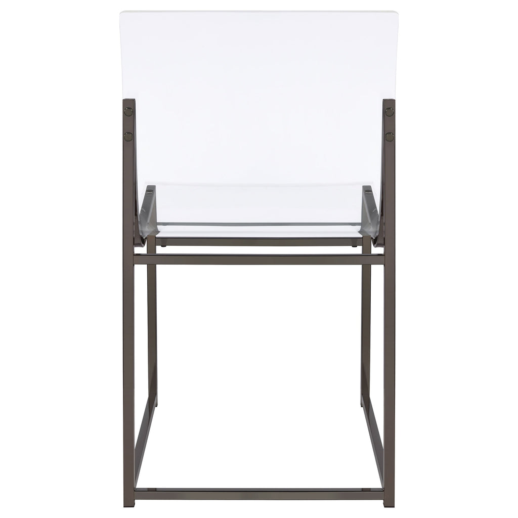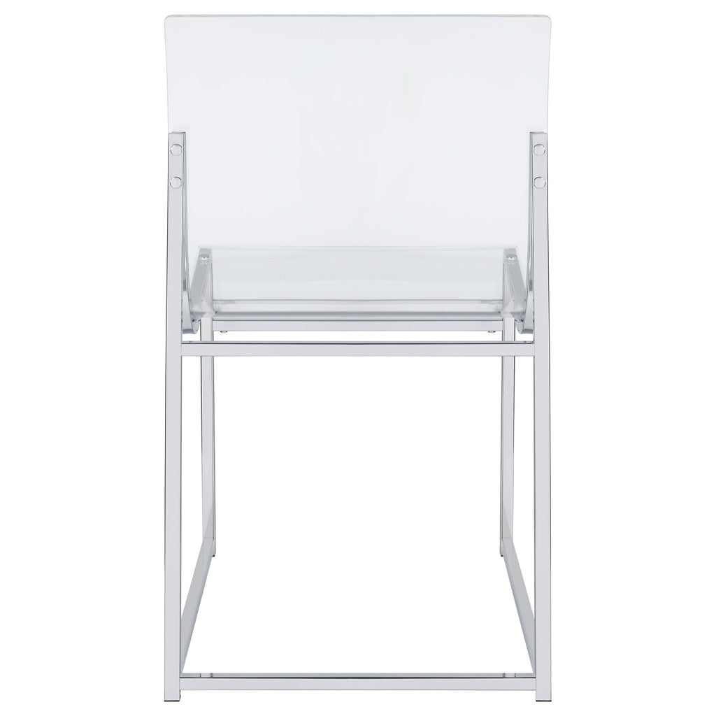 Step into the world of nouveau interior design with chairs that will turn conventional style on its head and become a central focus in your contemporary living environment. Customized for the experimental stylist, this set of two side chairs deliver surprising comfort, dabbling in a mix of materials striking a balance between industrial classic and pop culture retro design aesthetics. A metal frame with subtly rounded angles and straight lines forms a no-fuss look that relies on trending simplicity. A clear acrylic sheath is sturdy enough to support weight and provide a peek-a-boo view of the frame back. Paired with a table that duplicates its creative design, these chairs add unforgettable personality.
