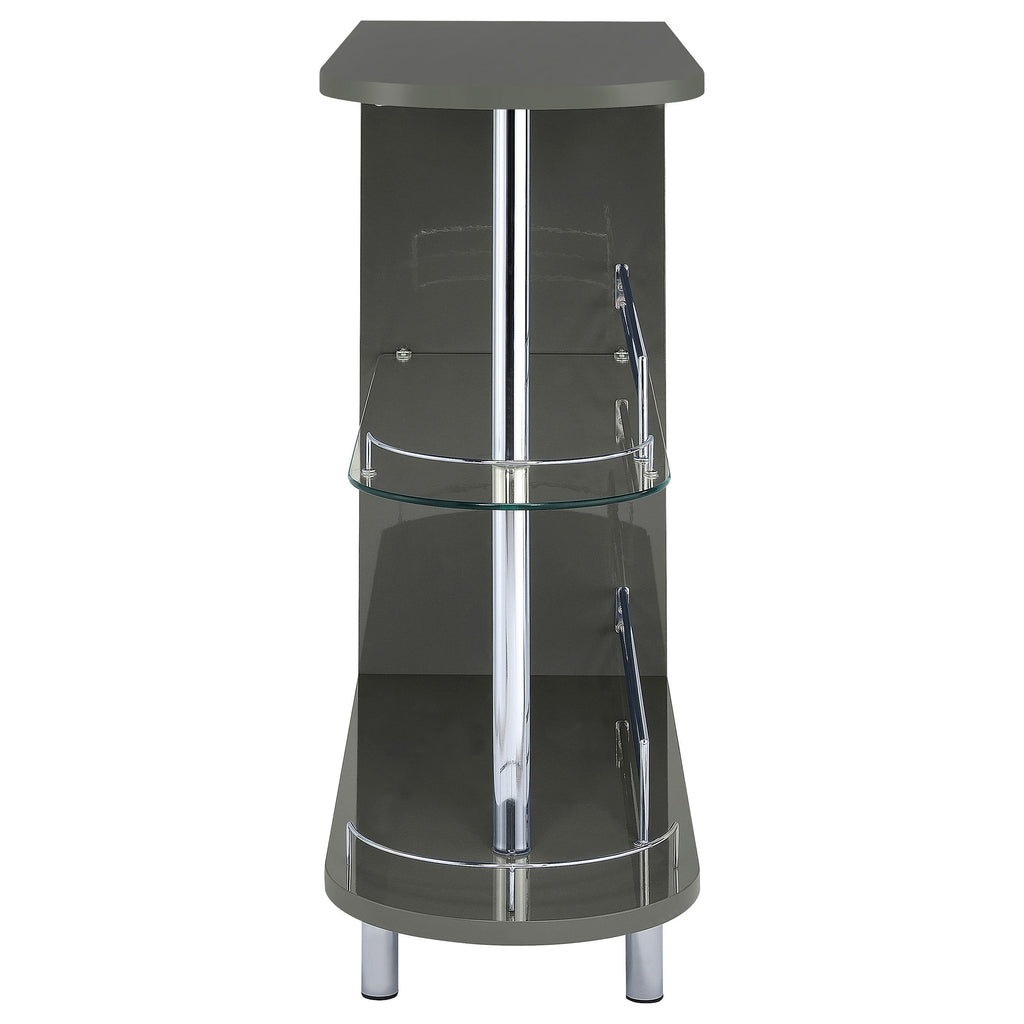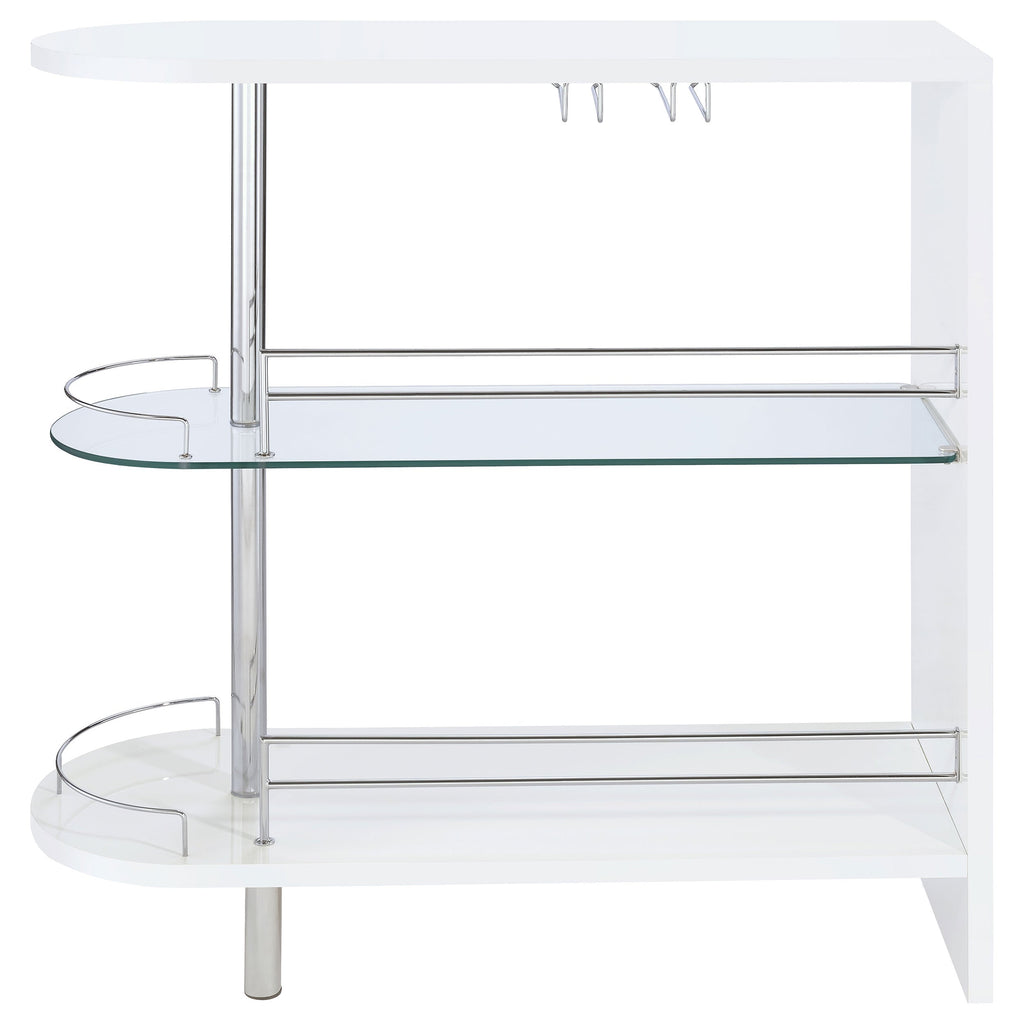 This stylish bar unit is a fabulous option for your entertaining needs. A sleek silhouette and glossy black finish give it a chic, modern appeal. Its tempered glass storage shelves offer a handy place to display a collection of fine wines and spirits. Protective guardrails help prevent accidental spills and keep bottles safe and secure. A handy stemware rack rounds out the versatile convenience of this contemporary bar unit.
