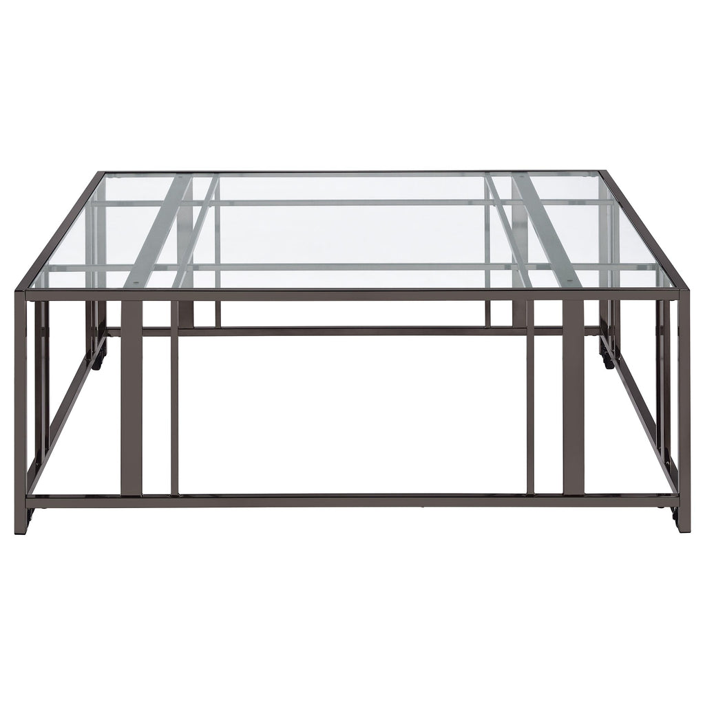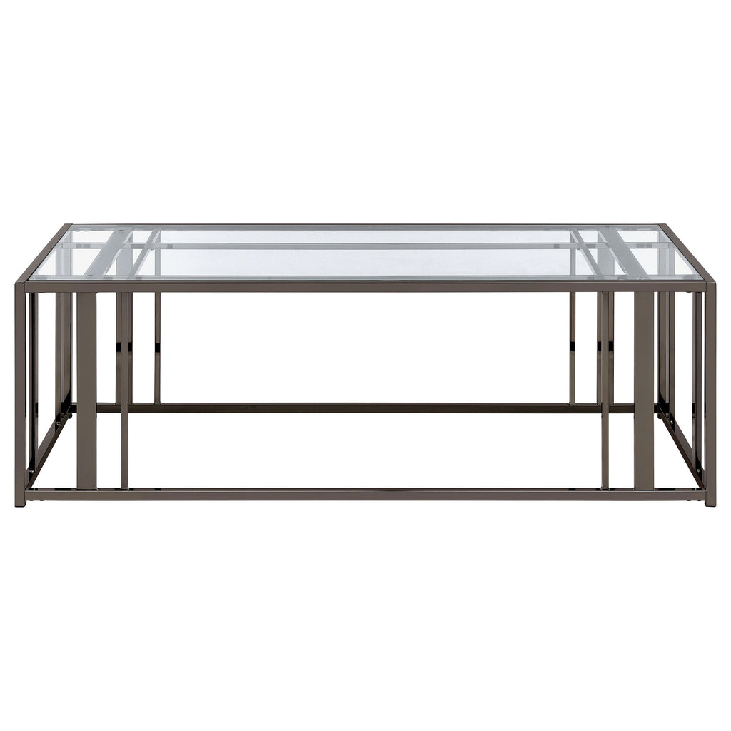 This modern rectangular coffee table features a clear tempered glass top paired with a geometric base made from heavy-gauge metal with a sleek electroplated finish. The open design offers a contemporary aesthetic, blending elegance with durability. Perfect for displaying decor or organizing essentials, its scratch-resistant materials ensure lasting quality. The compact design makes it an ideal addition to any living room, lounge, or small space.