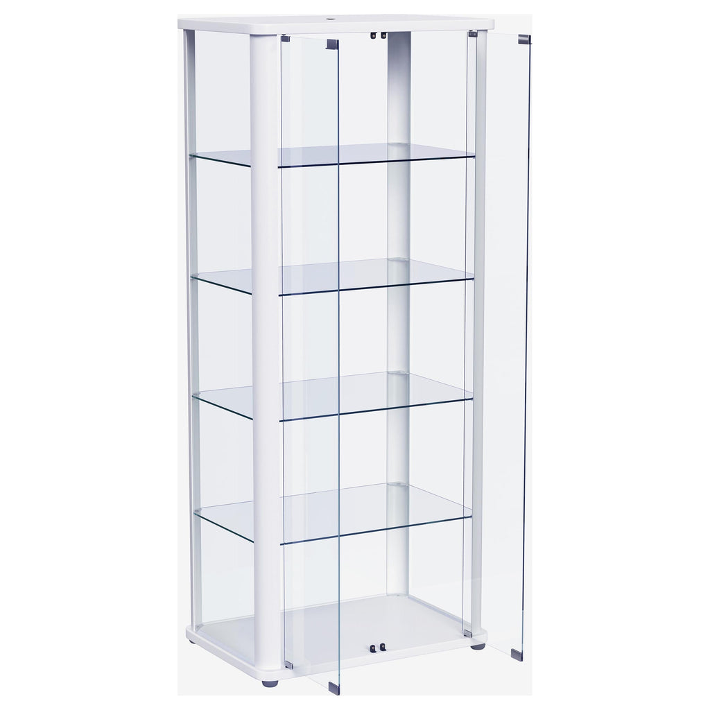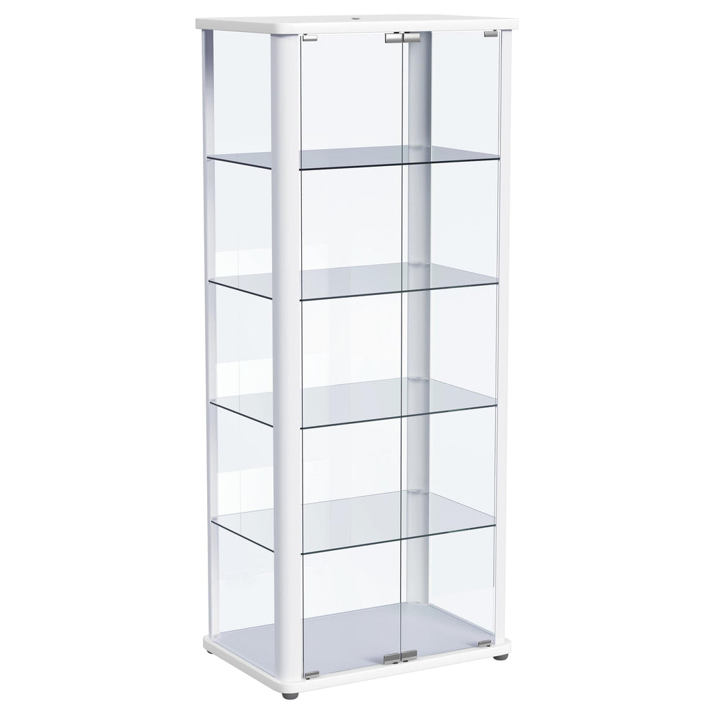 Gather all your favorite things and show them off to their best effect in a modern glass curio cabinet. Perfect for everything from China in the dining room to sculpture and art in your living area, the cabinet features rounded corners and a neutral finish, offering crisp style in any setting. Its glass sides and back are complemented with a pair of clear glass doors, offering a full view of items placed within. Four glass shelves hold an impressive number of treasures, creating a curated display you'll love. Recessed lighting completes the look to perfection.