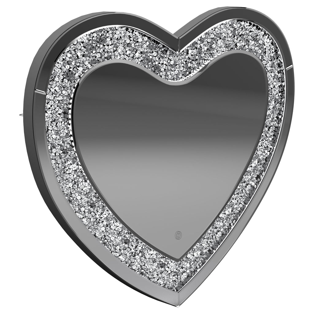 This heart-shaped wall mirror adds sparkle and function to glam-inspired spaces. Framed with mirrored glass and outlined by faceted acrylic crystal inlay, it delivers high-shine appeal. Integrated LED lighting enhances visibility for makeup, grooming, or daily routines. Designed for wall mounting, this decorative mirror combines charm and practicality—ideal for bedrooms, vanities, or dressing areas needing both style and illumination.