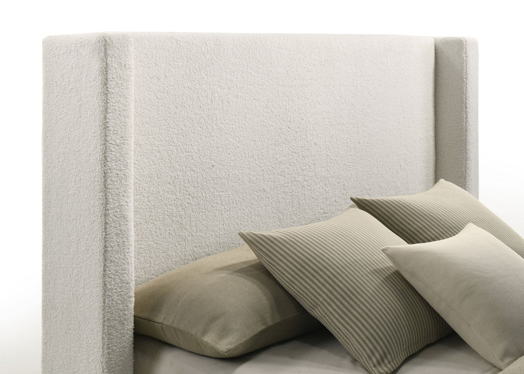 Center your haven from the world with a gorgeous modern upholstered bed. Complete with a classic wingback design, it's a fresh, soothing complement to surrounding decor. The bed boasts clean white boucle upholstery, offering an on-trend look that brims with cozy and inviting ambiance. The headboard is tall, matched with a lower footboard to create an open, airy silhouette. This stylish bed includes a full slat kit complete with added center supports, delivering robust support for a great night's sleep.
