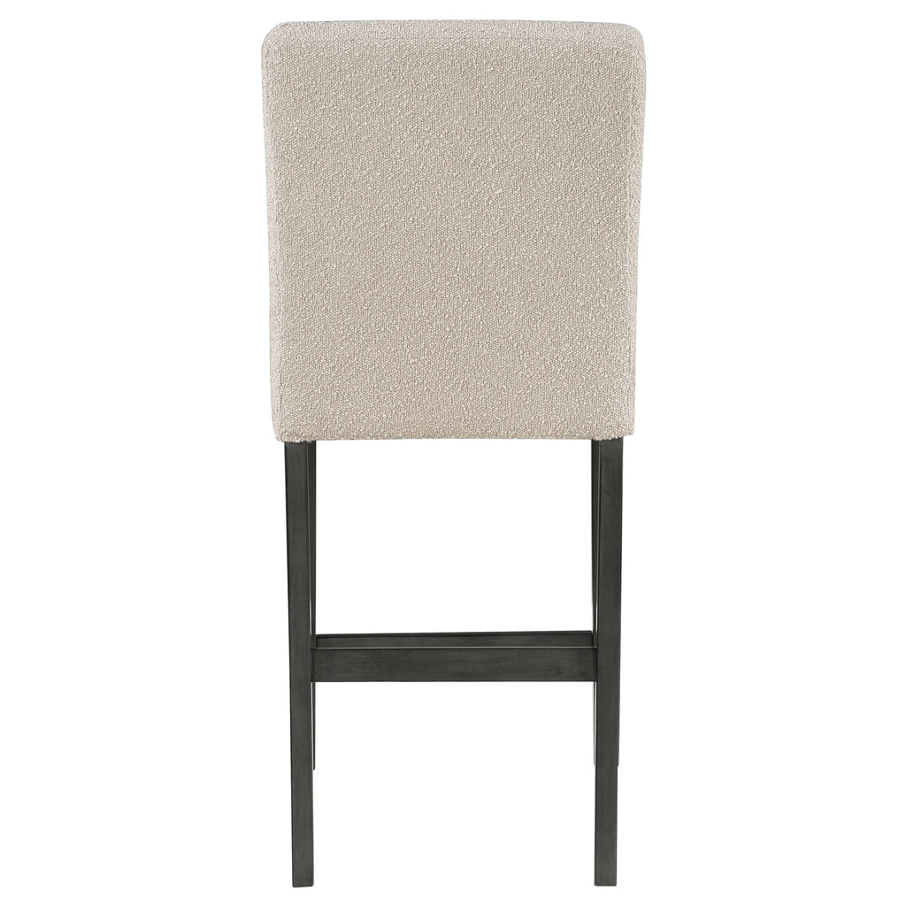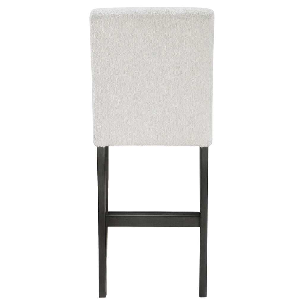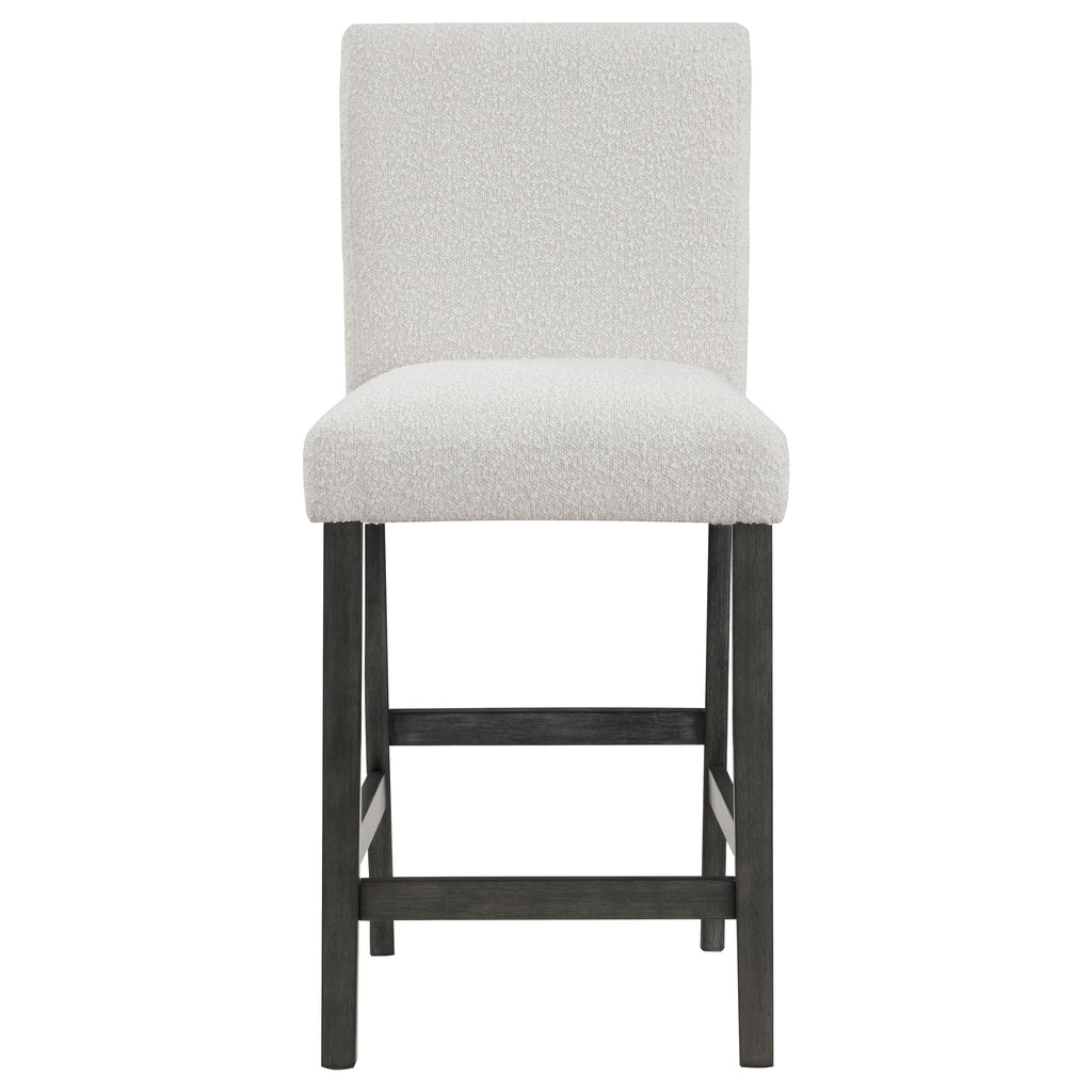 Elevate your dining experience with this chic counter height chair, a blend of simplicity and texture. Wrapped in the luxurious touch of boucle fabric, the chair offers a tactile feast, inviting guests to savor every second seated. Its silhouette stands tall on charcoal grey legs, a grounding finish that brings a sophisticated contrast to the chair's creamy hues. The understated elegance of this chair is a tribute to minimalist design, yet it hums with a warmth that enlivens any contemporary kitchen or bar area. It's where comfort meets style.