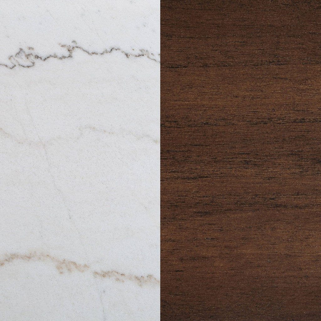 Gather at a table that exudes the natural elegance of a genuine white marble top, each one home to a unique map of delicate veining. This tabletop rests upon a solid poplar wood base, its dark brown finish narrating a story of enduring strength and classic beauty. The bold metal crossbar at its heart injects a touch of the contemporary, marrying the old with the new. As a centerpiece, this dining table brings not just a place to dine, but a space to connect, its robust and earthy foundation a grounding presence. Here, tradition and modernity dance in harmony, creating a dining experience wrapped in sophistication.