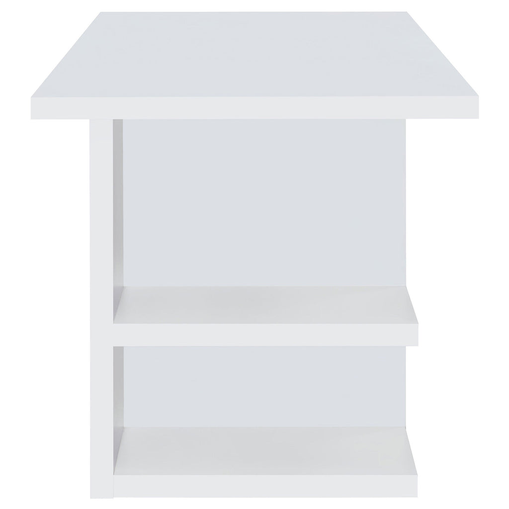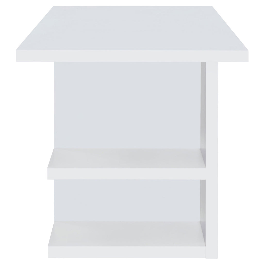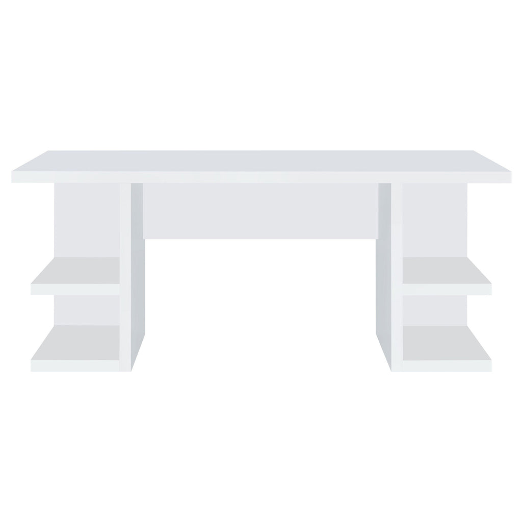 Clean lines and a smooth white finish surfaces all around, this modern writing desk boasts functionality and simplicity. Multiple side shelves offer space for storing textbooks, organized bins and more. The spacious tabletop surface has plenty of room for a large computer setup, along with a table lamp and other home office essentials. A wide space beneath invites you to slide up an office chair and tuck it beneath. Place this expansive writing desk in a dedicated home office, keeping everything you need close at hand.