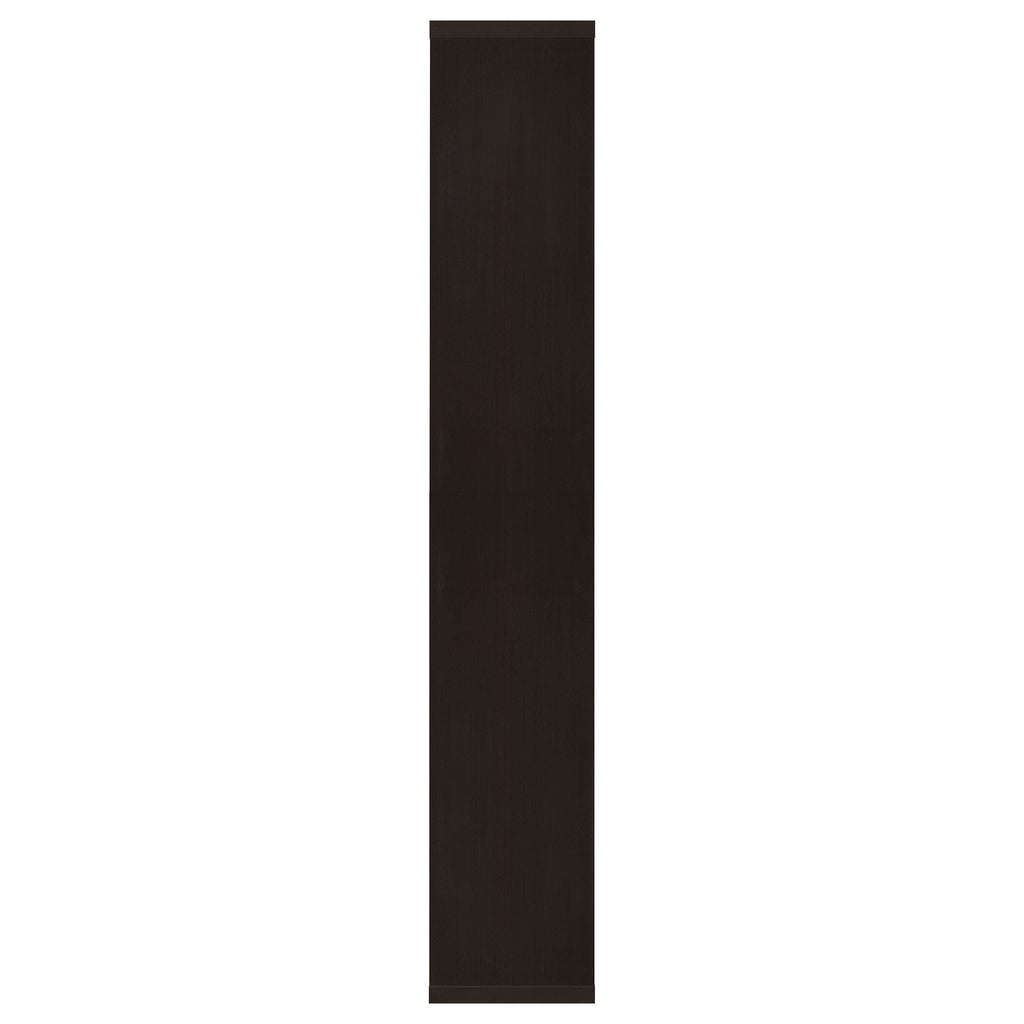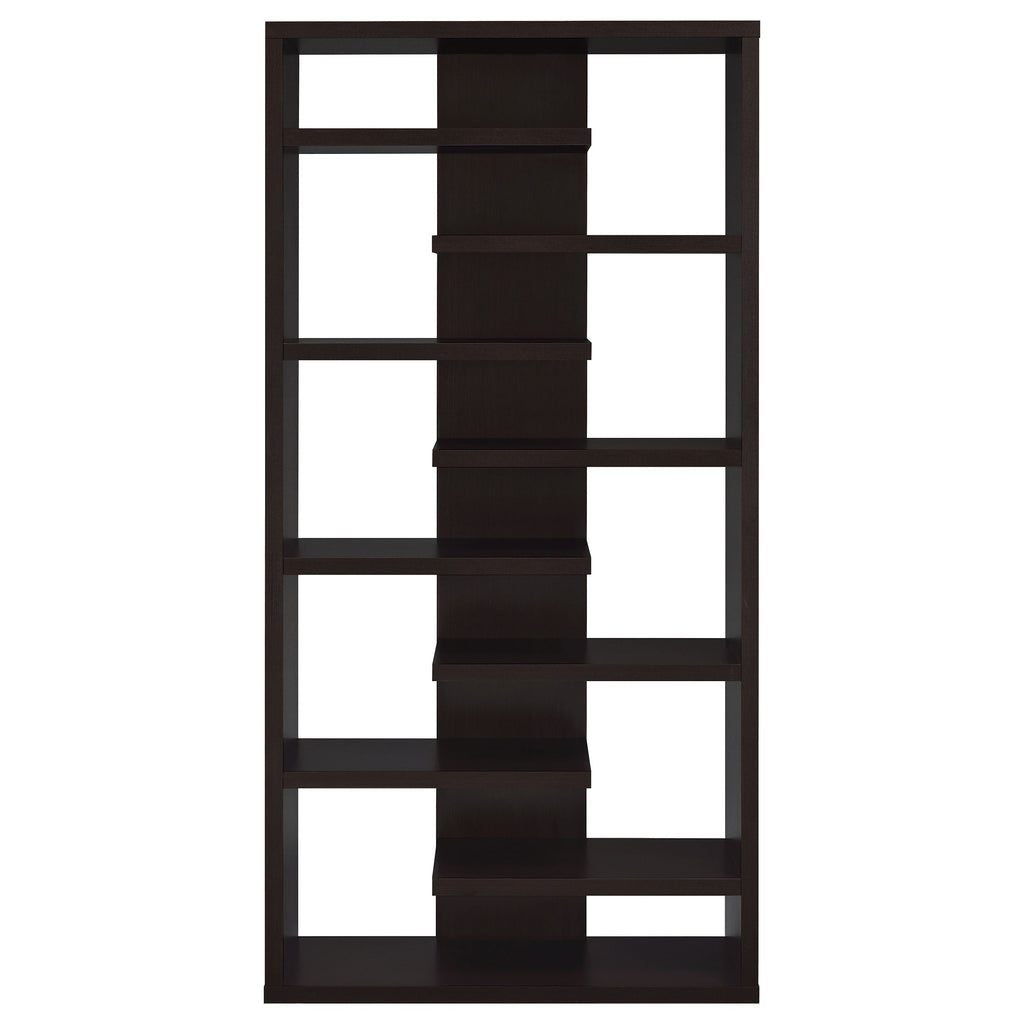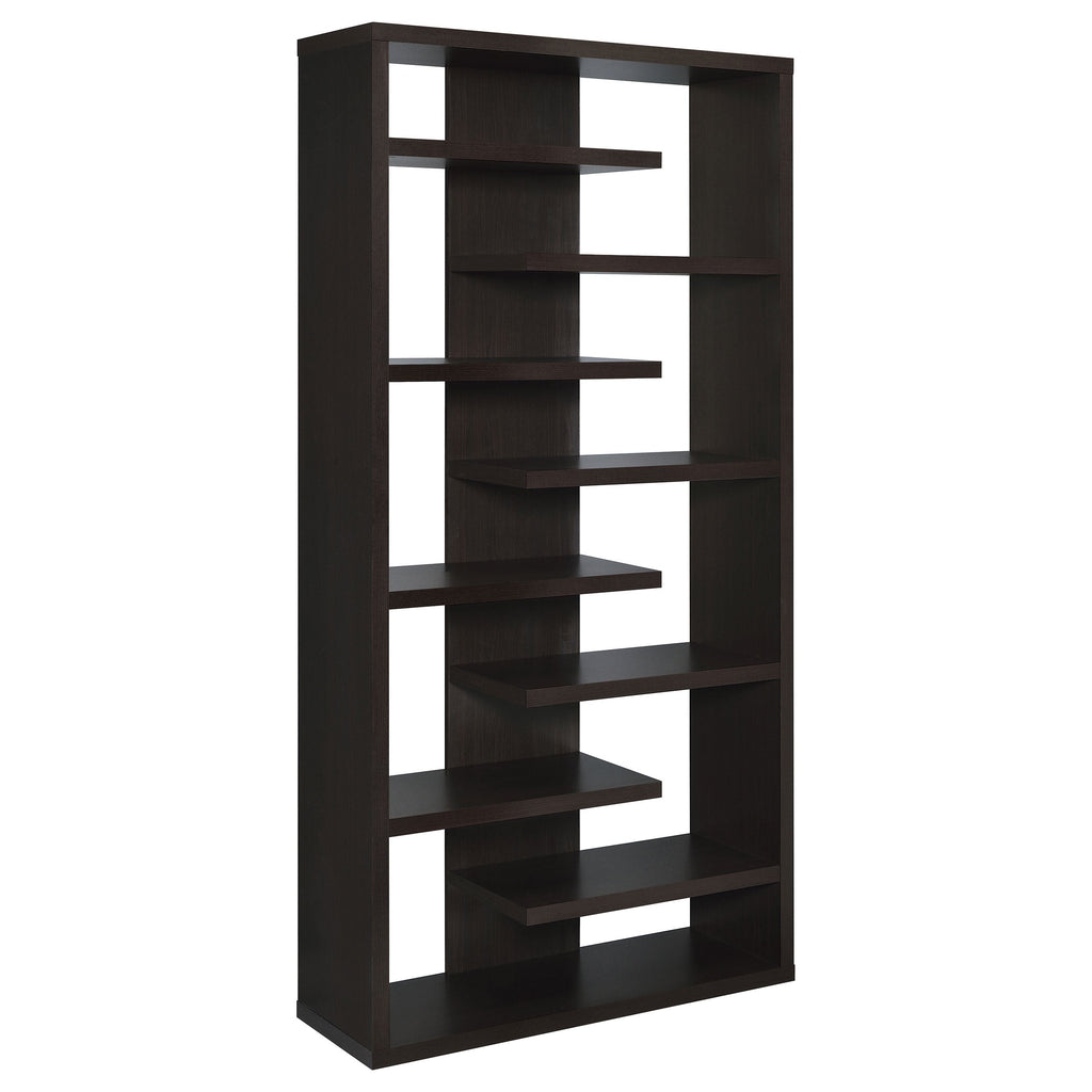Integrated shelving blends style with substance, making this bookcase a tremendous find. Linear design elements stagger to create a fresh, fun silhouette. With a cool cappuccino finish, it blends beautifully with a number of palettes. Increase storage and display options in a contemporary room with this tasteful piece. Display books, art, decor and even potted greenery.