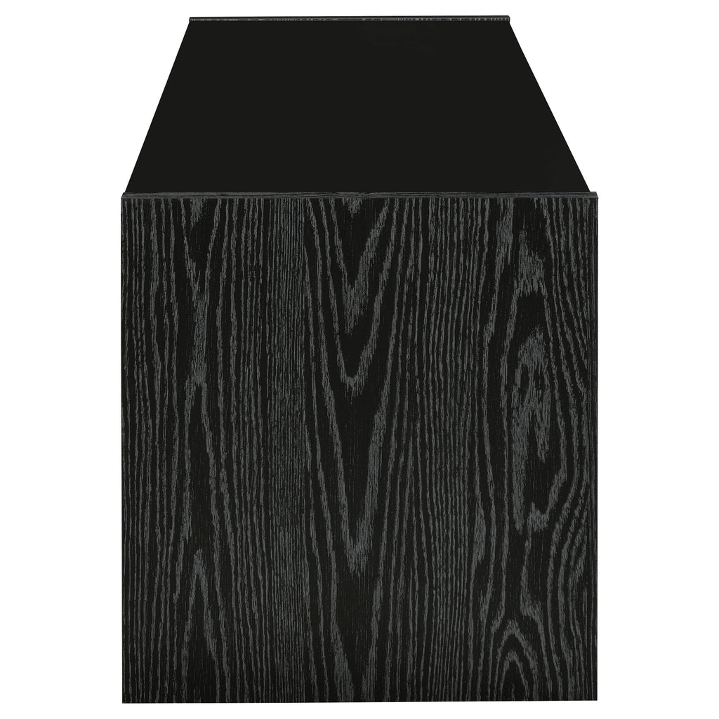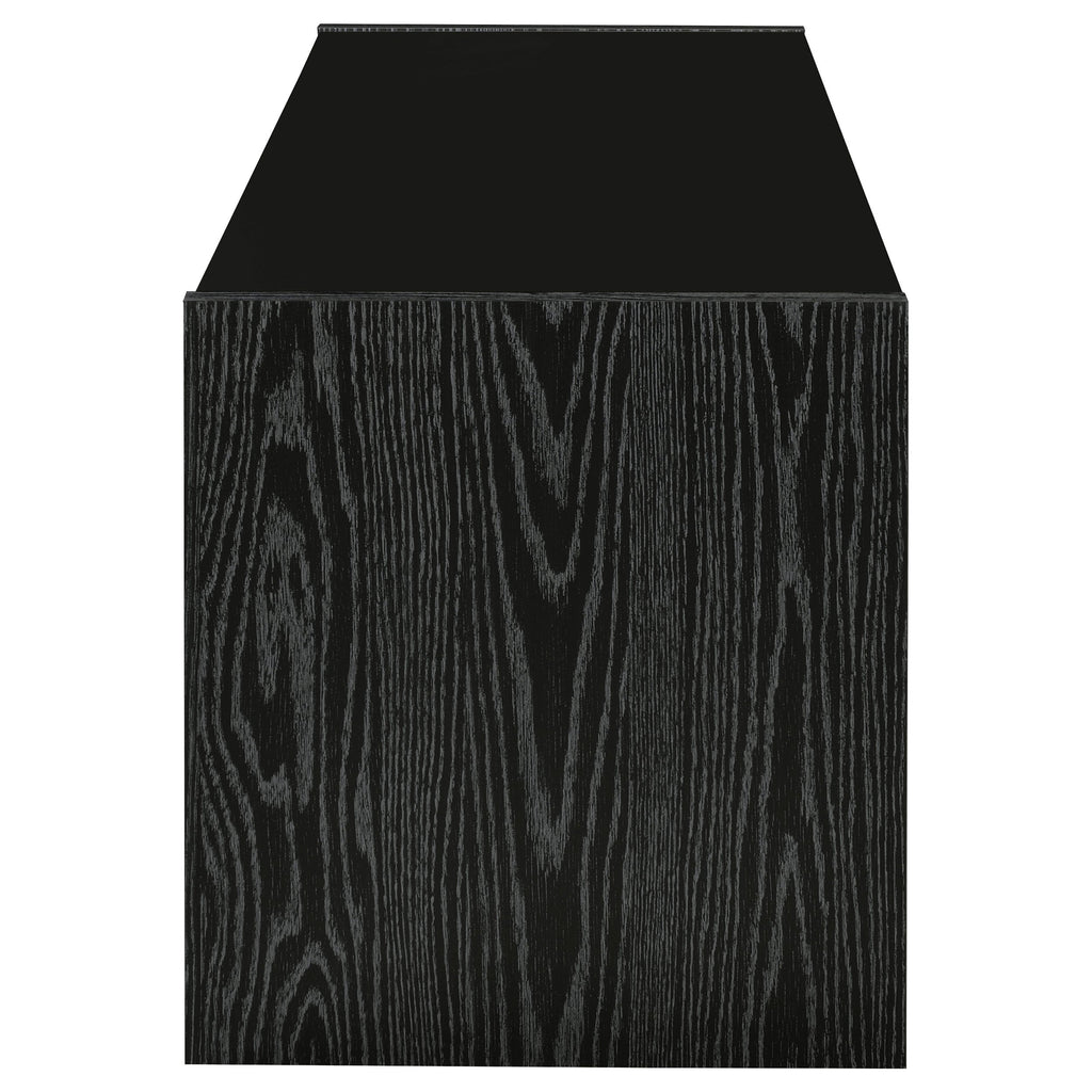 Sleek and modern, this TV console is a stylish choice. Exquisitely crafted from black oak, it boasts a classy, contemporary appeal that looks lovely in a den or family room. Brushed silver hardware creates a striking contrast to its bold, black finish. Three large drawers and two spacious compartments offer plenty of storage for electronics, games, movies, and more. Whether you're gathering loved ones for movie night or enjoying a gaming marathon, this console provides hours upon hours of entertainment.