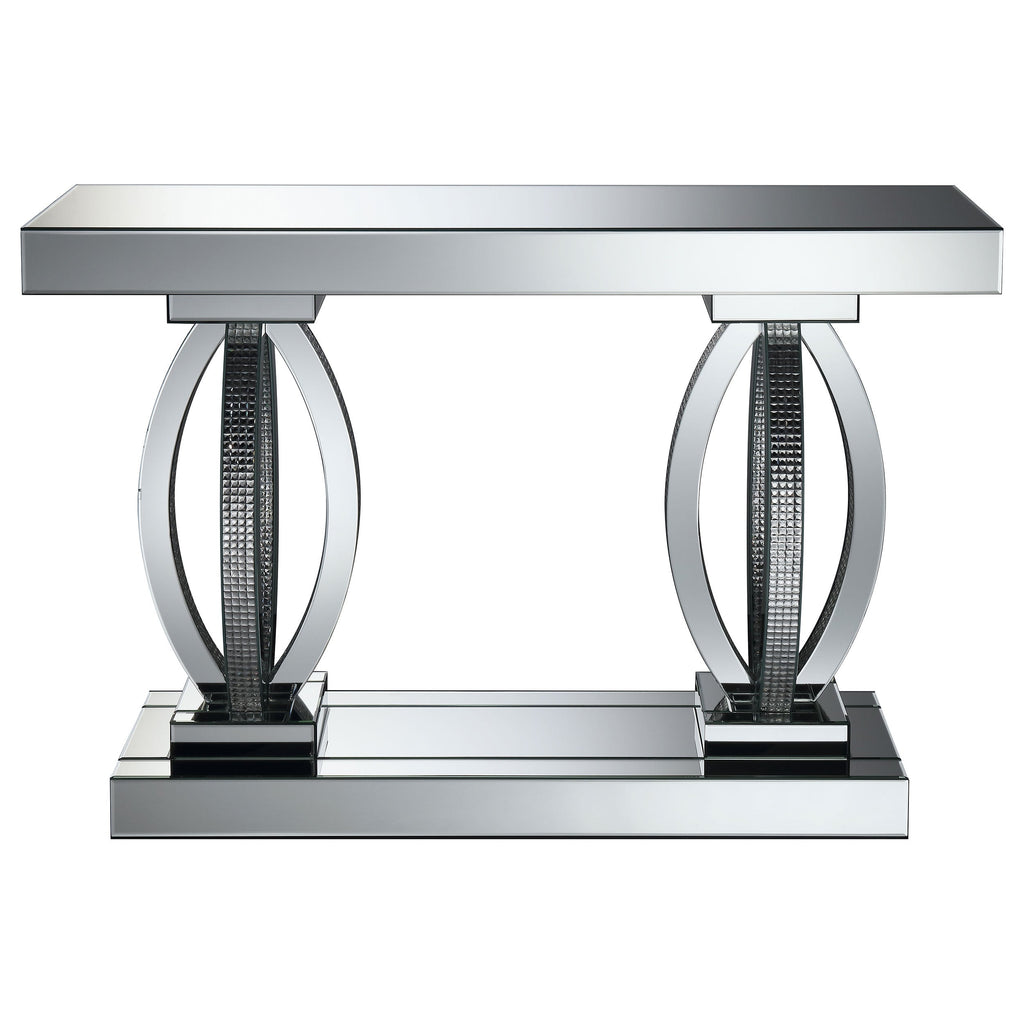 Mirrored console table with sleek rectangular top and bold oval-shaped bases