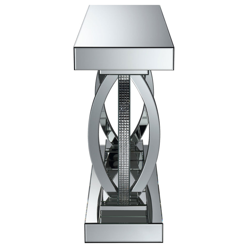 This mirrored console table features an elegant design with a rectangular top and bold, oval-shaped bases. The base is adorned with acrylic crystals, adding a luxurious and glamorous touch to its modern aesthetic. Crafted with mirrored surfaces, this table reflects light beautifully, creating an ambiance of sophistication. Ideal for entryways, living rooms, or hallways, this console table combines style and functionality with a focus on durability.