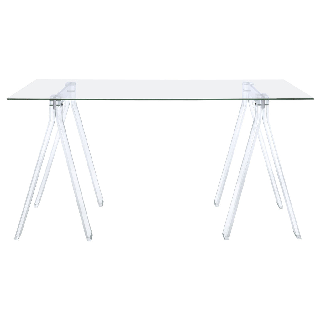 Enjoy an airy workspace with this 59-inch writing desk, pairing a sleek acrylic sawhorse base and a clear tempered glass top. Heavy gauge steel supports, finished in electroplated chrome, connect the legs for added stability and a polished accent. The translucent design keeps your office bright and open, suiting both modern and minimalist décor. Perfect for writing, studying, or creative tasks, this piece merges function and cutting-edge style seamlessly.