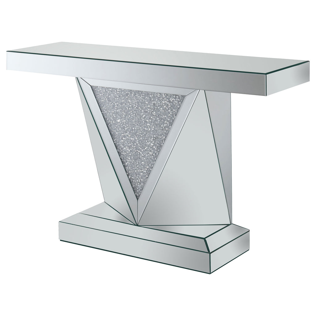 This mirrored console table features a sleek rectangular design with a bold, geometric base. The triangular inlay is adorned with acrylic crystals, enhancing its modern appeal. Made with mirrored surfaces, the console offers a sophisticated look that reflects light beautifully, adding elegance to any room. Crafted with durable materials, it provides a sturdy foundation while its clean lines create an eye-catching focal point in your home.