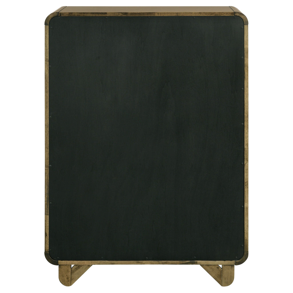 This five-drawer chest provides ample storage space while maintaining a sleek, contemporary aesthetic. The nutmeg wood finish offers a rich and inviting feel, while the rounded corners soften the design for a modern look. Each drawer is fitted with metal extension glides, ensuring smooth operation and easy access. The minimalist matte nickel hardware adds a refined touch to the chest's clean lines. Made from solid Asian hardwood, this chest combines practicality with modern design for a stylish and functional addition to your bedroom.