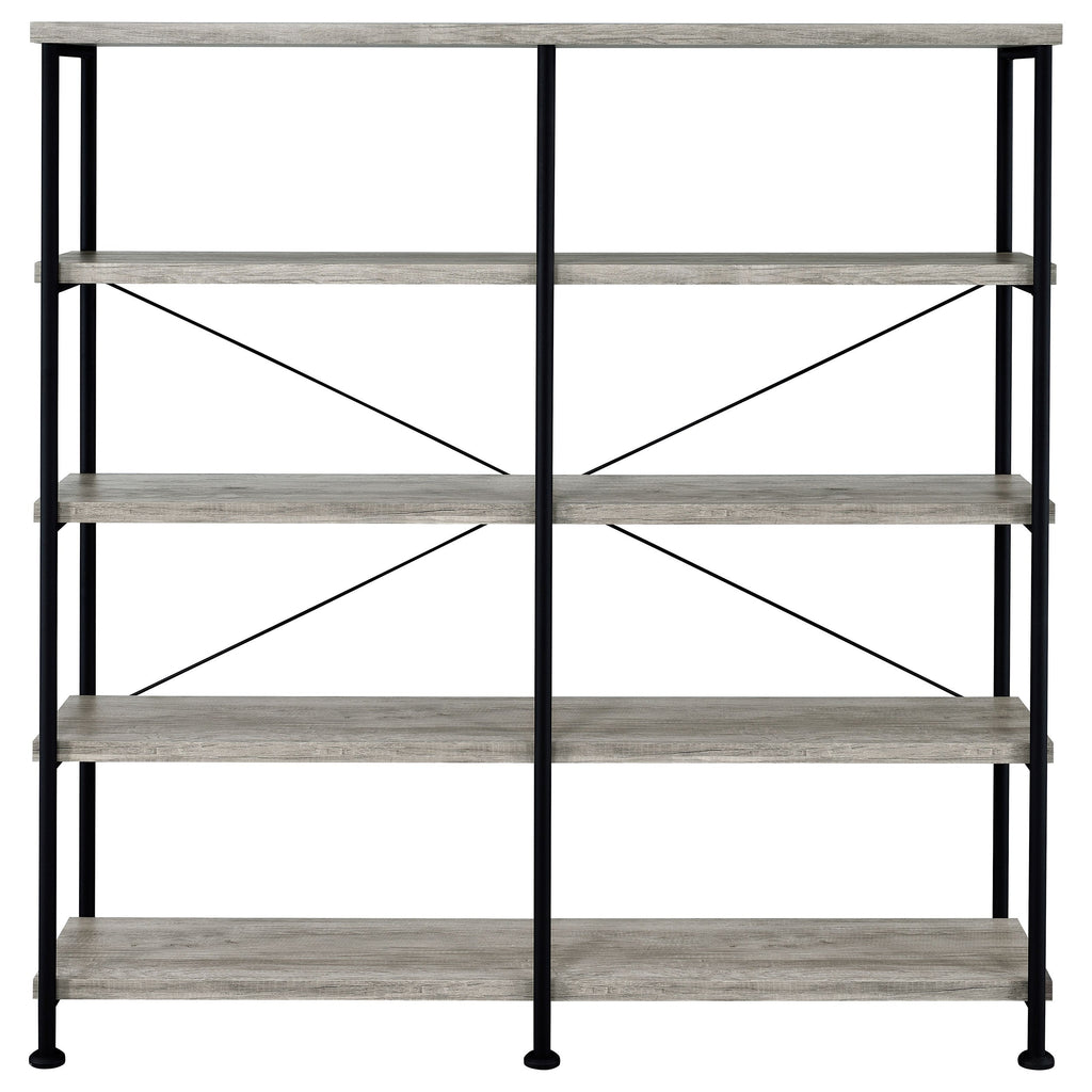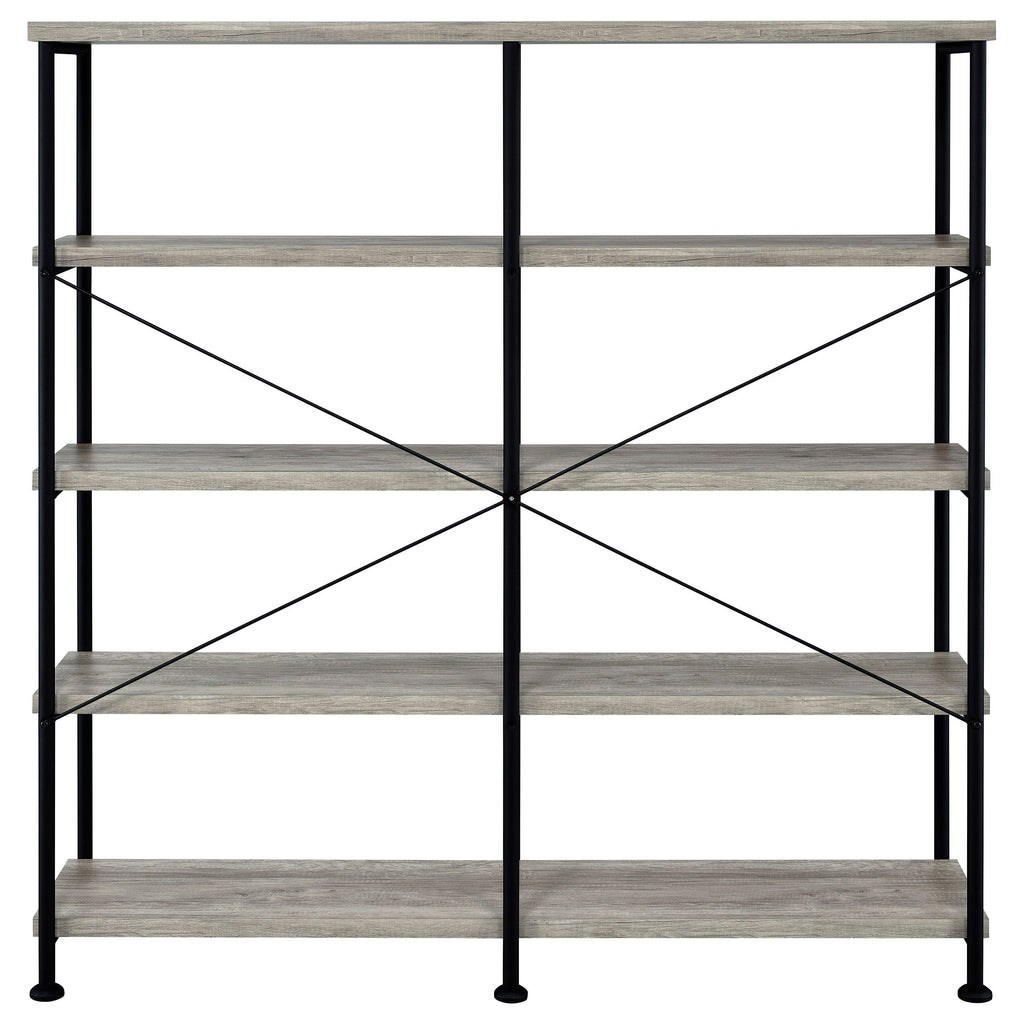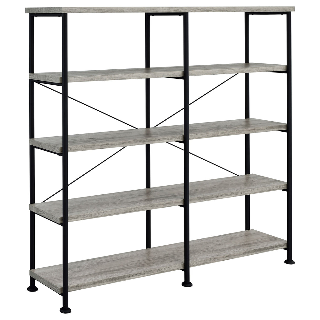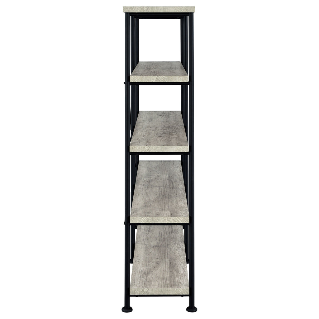 Rustic industrial bookcase in grey driftwood with black metal frame boasts clean lines for your modern decor