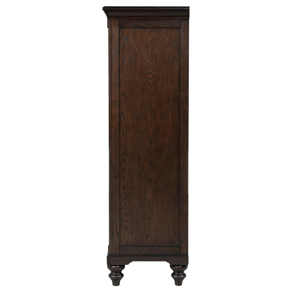 This door chest combines classic style with functional storage, making it a unique addition to your bedroom. It features six spacious drawers alongside a four-tier cabinet with tempered glass framed by solid wood, offering a display space for decor or easy access to folded clothing. The dark oak finish brings warmth and depth to the piece, while the gunmetal hardware offers a subtle modern accent. Built from poplar and oak veneers, this door chest is both stylish and durable, perfect for adding both storage and character to your space.