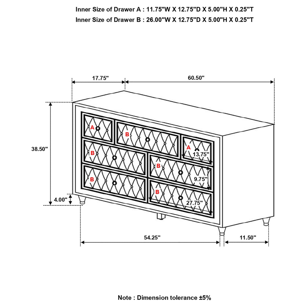 Dresser: Width: 60.50, Depth: 17.75, Height: 38.50, Weight: 180.81