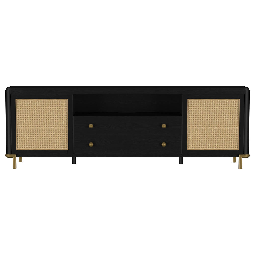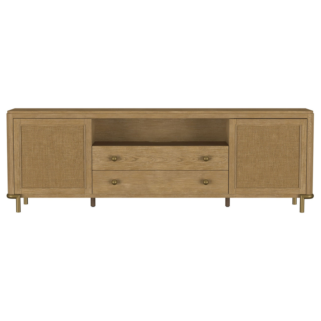 This refined entertainment unit transforms your living room with artisanal detail. Accommodating up to 85-inch displays, this TV stand integrates Asian hardwood, engineered wood, ash veneer, and rattan. A modern neutral finish and aged brass legs exude timeless appeal. With drawers and hidden storage, it excels as a media console or TV shelf. A versatile TV console and media stand, it ensures an elegant entertainment center and functional media cabinet.