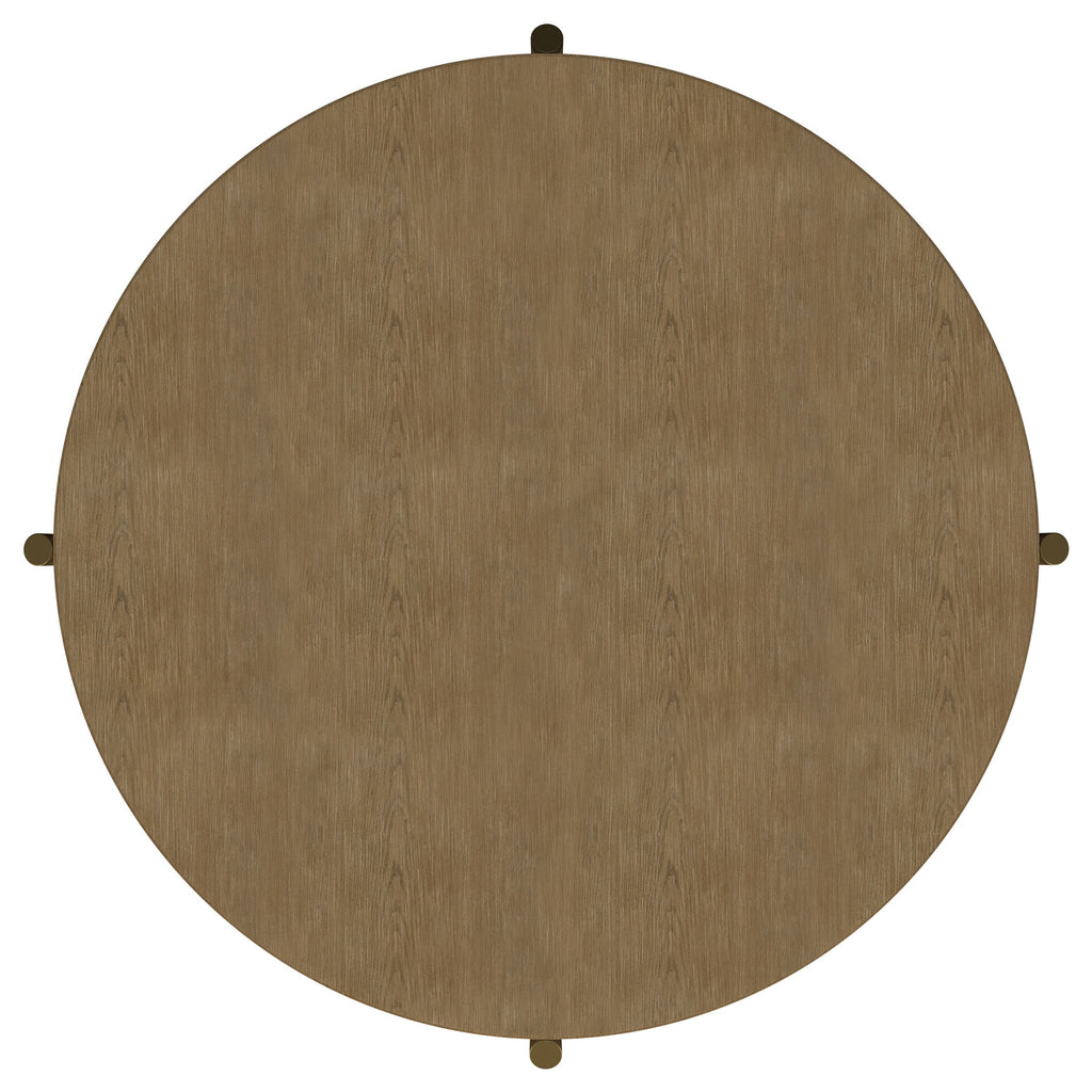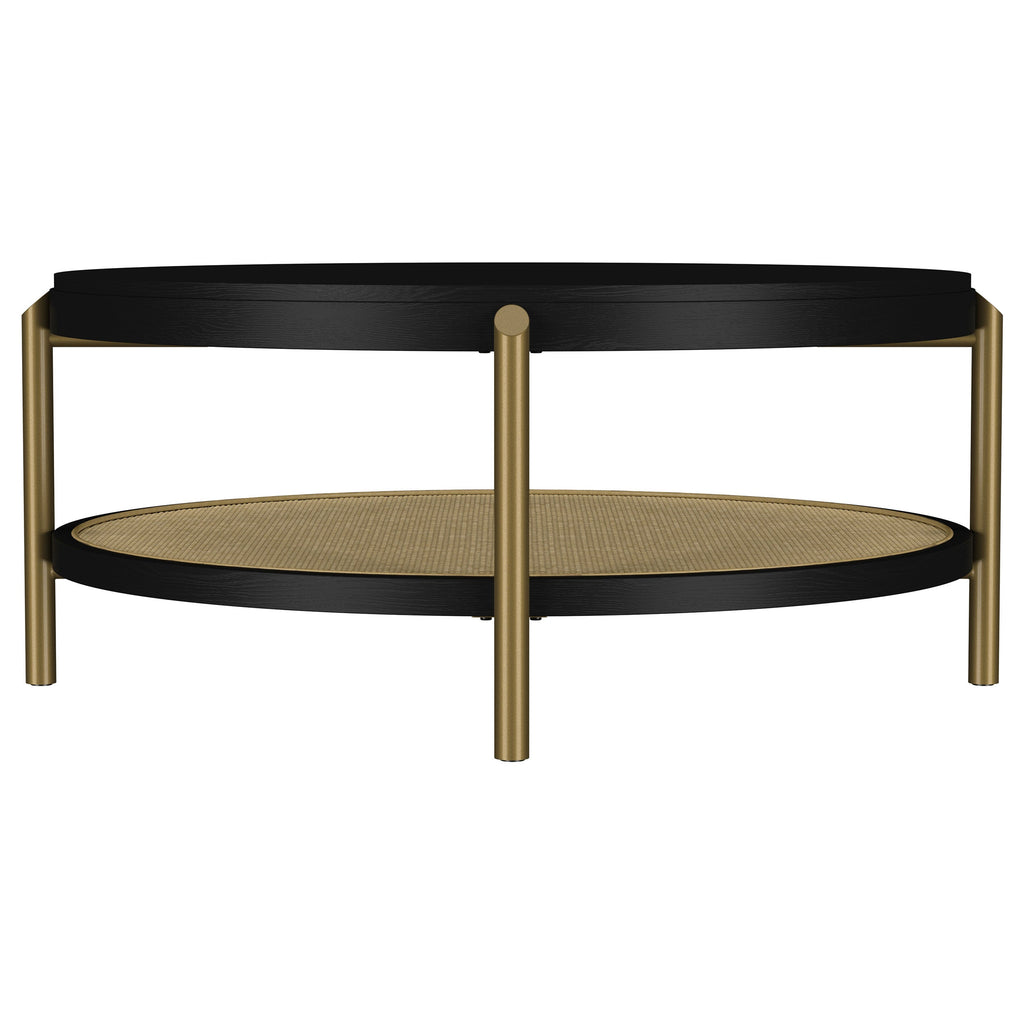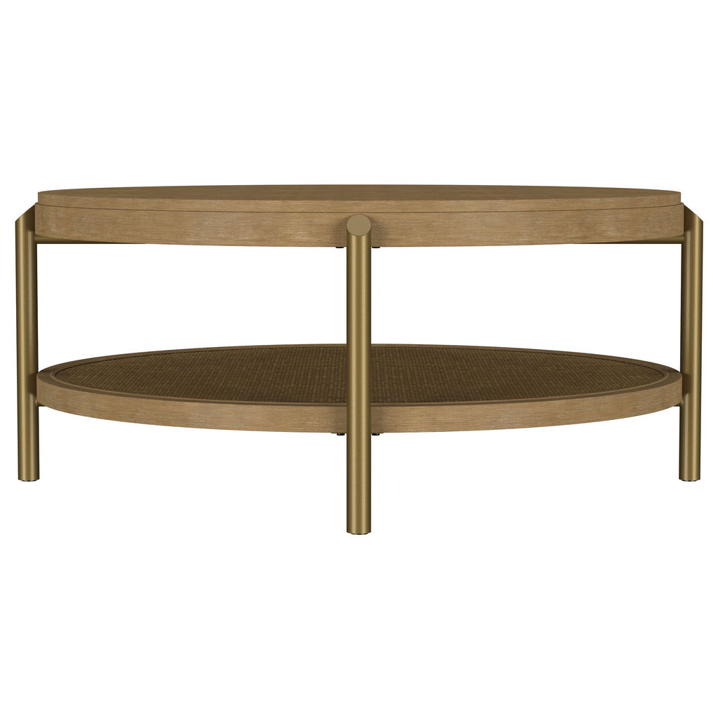 This round coffee table combines modern design with rustic charm, perfect for today’s living spaces. Crafted with Asian hardwood, engineered wood, and ash veneer, its smooth finish highlights the natural wood grain for an organic appeal. The lower shelf features woven rattan, offering practical storage and a textured look. Supported by aged brass-finished metal legs, this cocktail table delivers a balance of durability and style, serving as a functional centerpiece for any living room or lounge area.