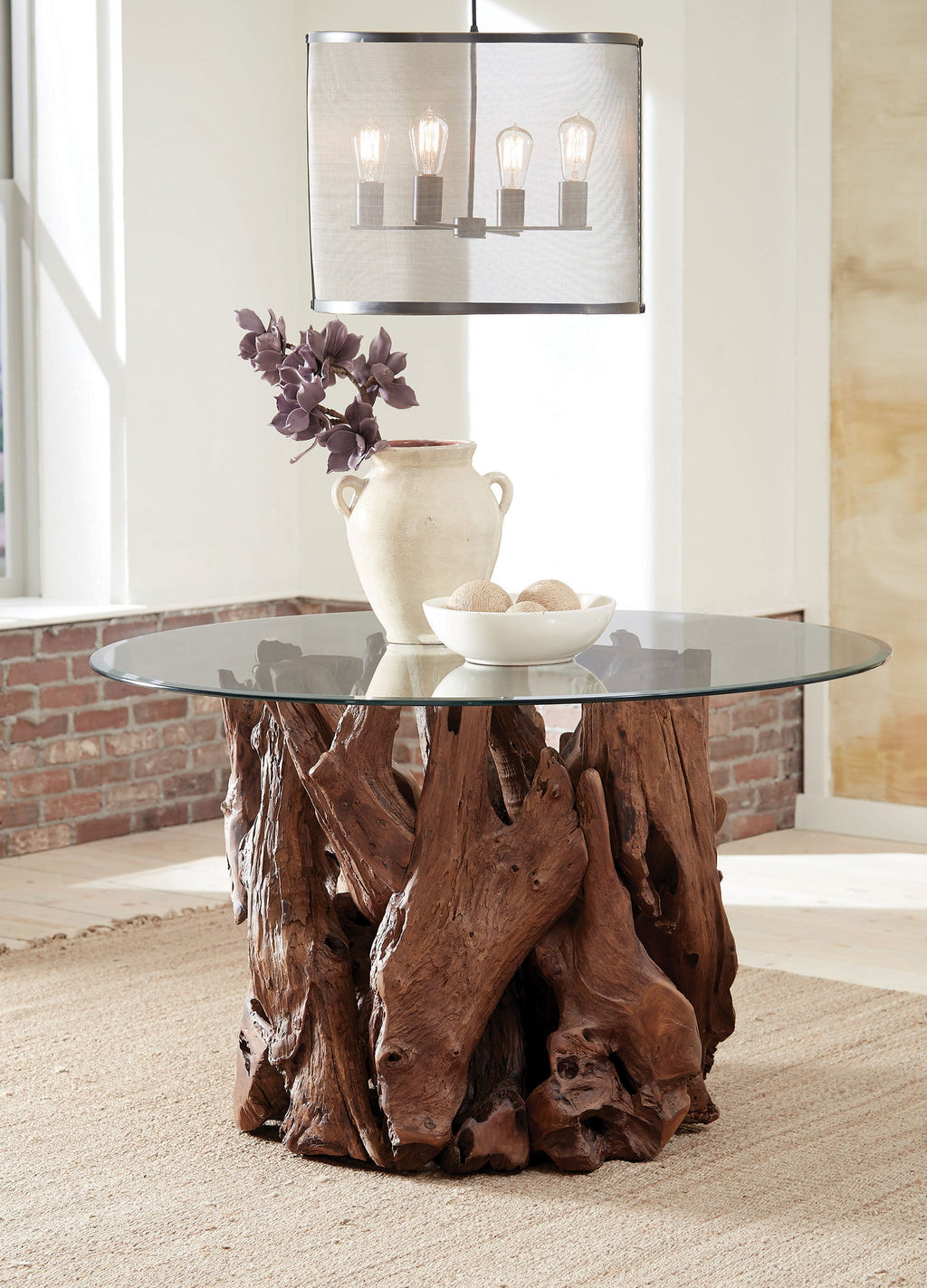 Update the organic look of your home or office decor with this Mother Nature-inspired roots style table. Each base is meticulously hand crafted to be one of a kind. The magnificent wood comes from sustainable teak tree roots sourced from Indonesia. A delightful natural light brown finish adds a deeper element of character. A tempered 10mm-thick round glass top is available separately, making this table perfect as coffee table in the living room or office.