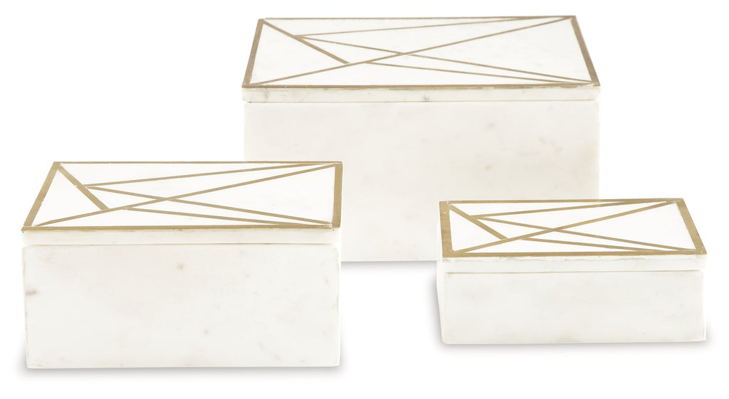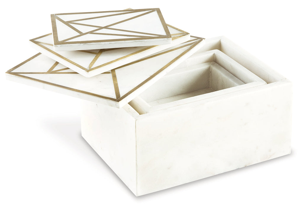 This set of three keepsake boxes makes storage so striking. The sleek marble design is completed on top with a brass-tone metal inlay. Adding a touch of brilliance to your decor, this set is the perfect place for your dearest keepsakes.