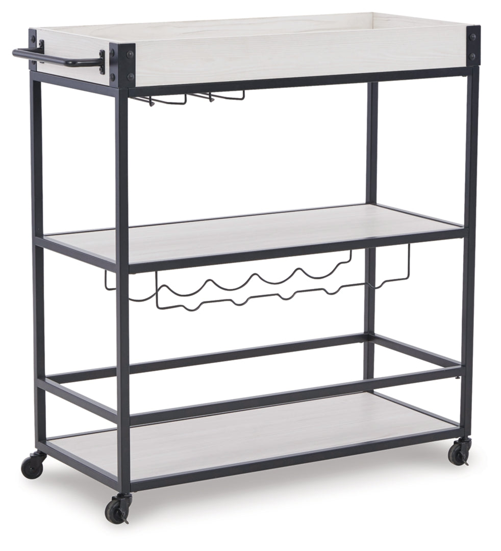 Impress your party guests in style with this bar cart. A whitewash finish keeps the top tray shelf and two lower shelves looking crisp. A stemware rack holds wine glasses with ease, while a slim rack on the bottom shelf holds wine bottles for sleek storage. Smooth-gliding casters provide easy mobility.