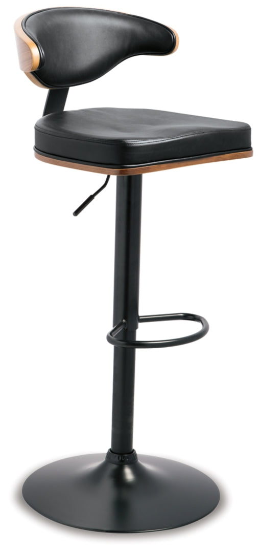 Style takes quite a modern turn. Sporting a distinctively contoured back, this upholstered swivel bar stool is sure to bring an elevated look to your living space. Wrapped in a black faux leather upholstery, the seating area’s artful contours put the accent on comfort.