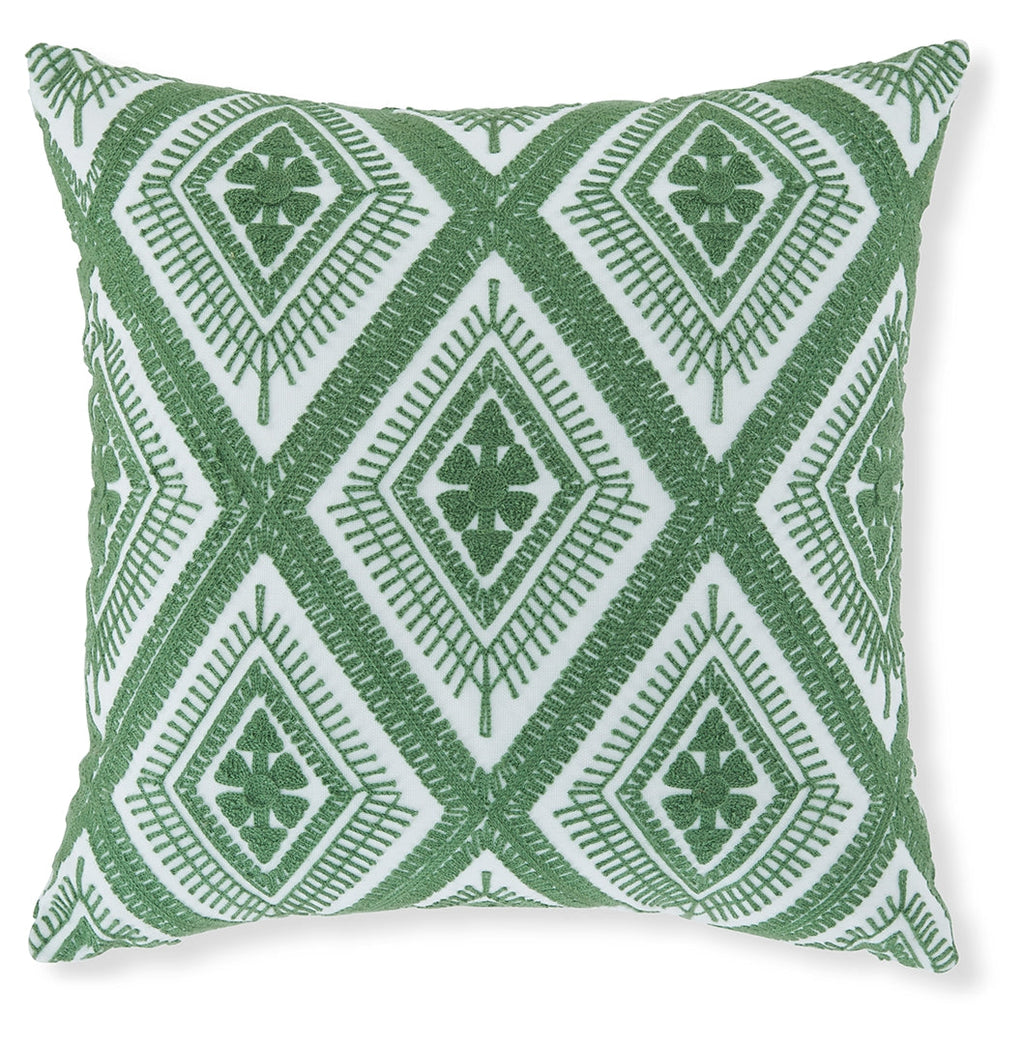 Add a splash of vibrant color and radiant style to your furnishings with this accent pillow. Its diamond design in green and white adds an eye-catching scheme to indoor/outdoor benches, chairs and sofas.