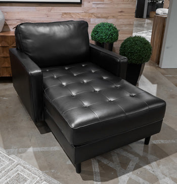 This chaise embodies timeless mid-century elegance with its linear design, sleek track arms and tapered legs. Genuine leather in the seating area adds a luxurious touch to the overall look. Experience endless style opportunities for today's living spaces.