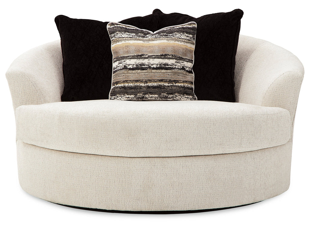 Let it snow. Doubling your pleasure with a spacious seating area with room for two—or just you—this oversized round swivel chair in a snow-tone neutral invites you to stretch your style in an easy-elegant way. Whether your aesthetic is urban hip or suburban chic, this posh swivel chair is sure to look and feel right at home. Wrapped in a chunky heavyweight chenille fabric with a delightful touch, this fashion-forward chair includes designer pillows for a brilliant pop of color and texture.