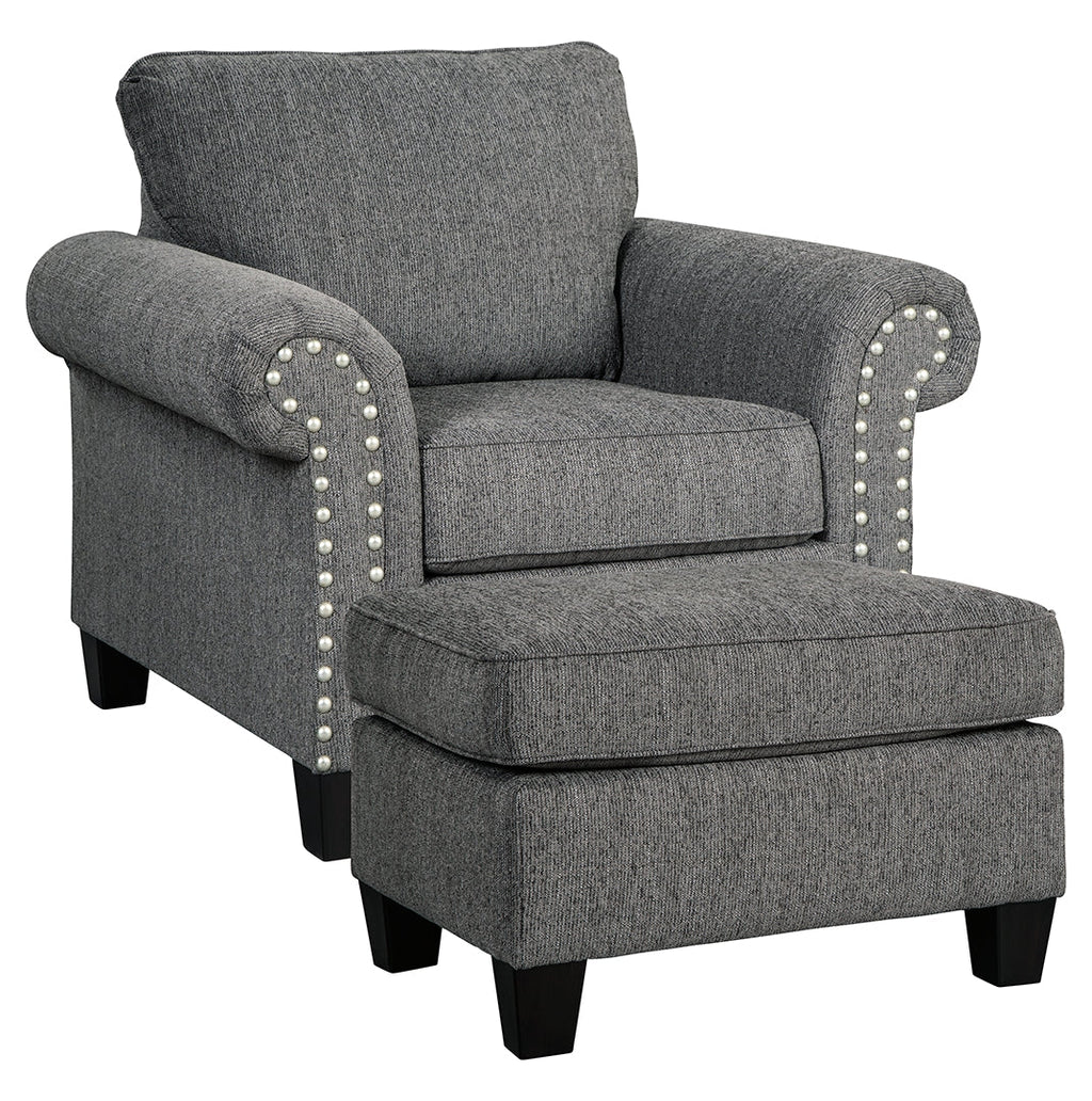 A contemporary dream. This chair and ottoman check off everything on your list. Designer profile is accentuated with roll arms and pewter-tone finished nailhead trim. Upholstered in a textured chenille, the feel is up to par with the look. Tapered accent legs finish off top-to-bottom style.