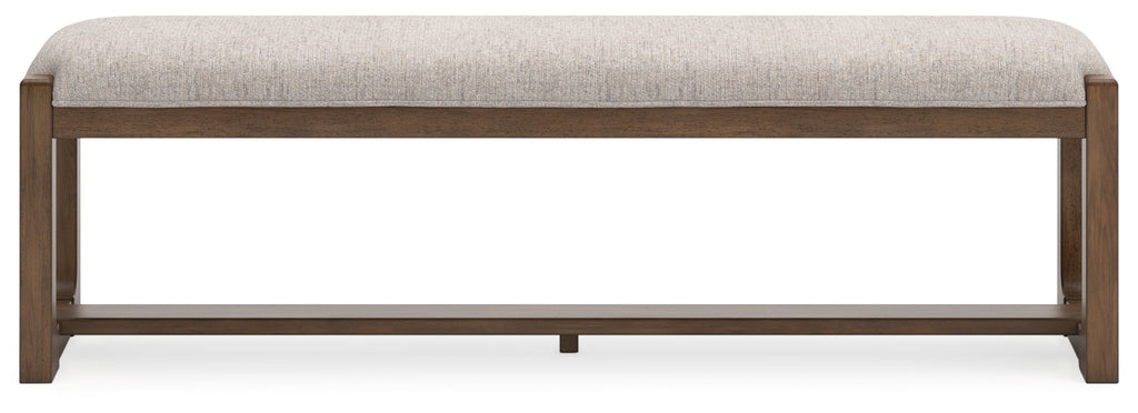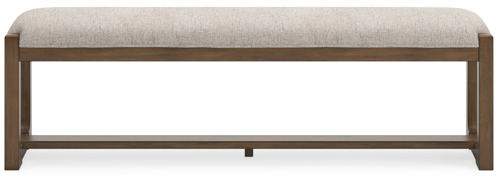 This dining bench sits comfortably at the intersection of modern lodge and farmhouse aesthetics. Your warm and welcoming disposition is reflected in its charming architectural elements and neutral textural fabric. Even with its poise, the bench remains practical. Its cushioned seat invites you to linger longer at the table, defining your dining room with reliable function and style.