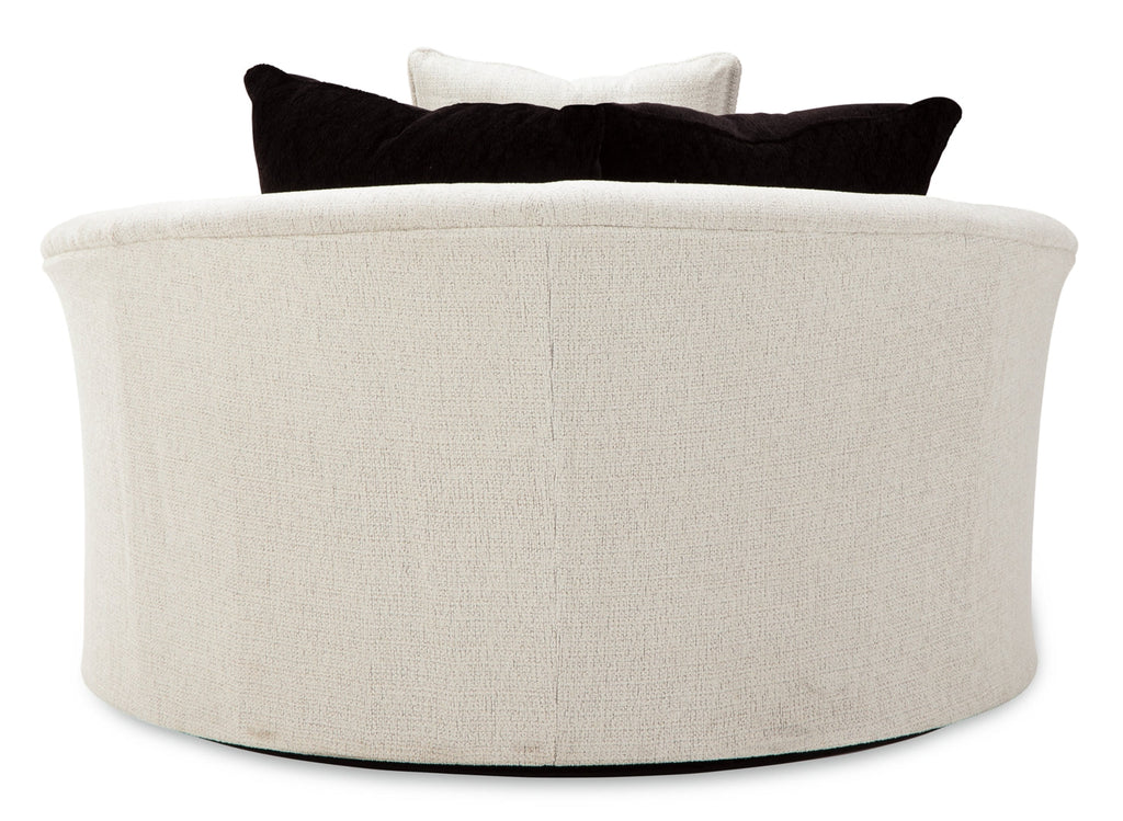 Let it snow. Doubling your pleasure with a spacious seating area with room for two—or just you—this oversized round swivel chair and ottoman set in a snow-tone neutral invites you to stretch your style in an easy-elegant way. Whether your aesthetic is urban hip or suburban chic, this posh swivel chair is sure to look and feel right at home. Wrapped in a chunky heavyweight chenille fabric with a delightful touch, this fashion-forward set includes designer pillows for a brilliant pop of color and texture. And how’s this for a welcome surprise: the storage ottoman sports a built-in tabletop with cup holders on the flip side!