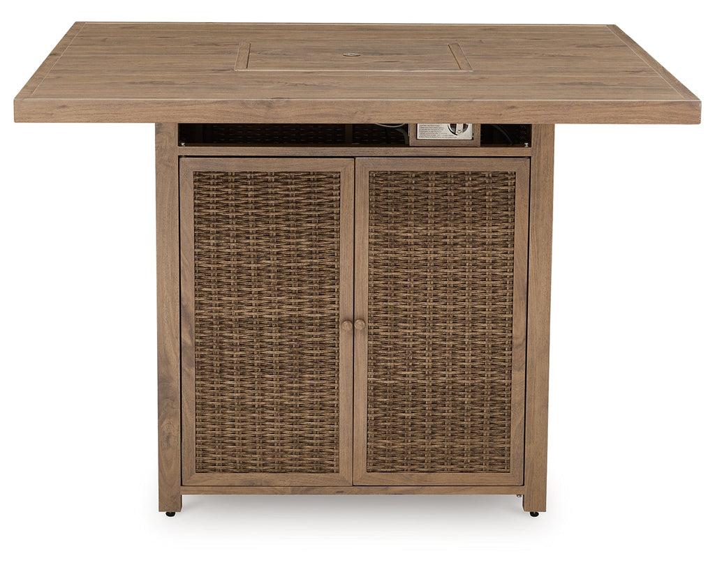A perfect balance of design and utility, this bar table with fire pit turns any outdoor living space into your own piece of paradise. Crafted with easy-care resin wicker over an aluminum frame with the look of wood, it's the epitome of California dreamin' style. The press of a button ignites a flickering flame that dances over a bed of glass beads. And with room for up to eight, it’s one highly accommodating table.