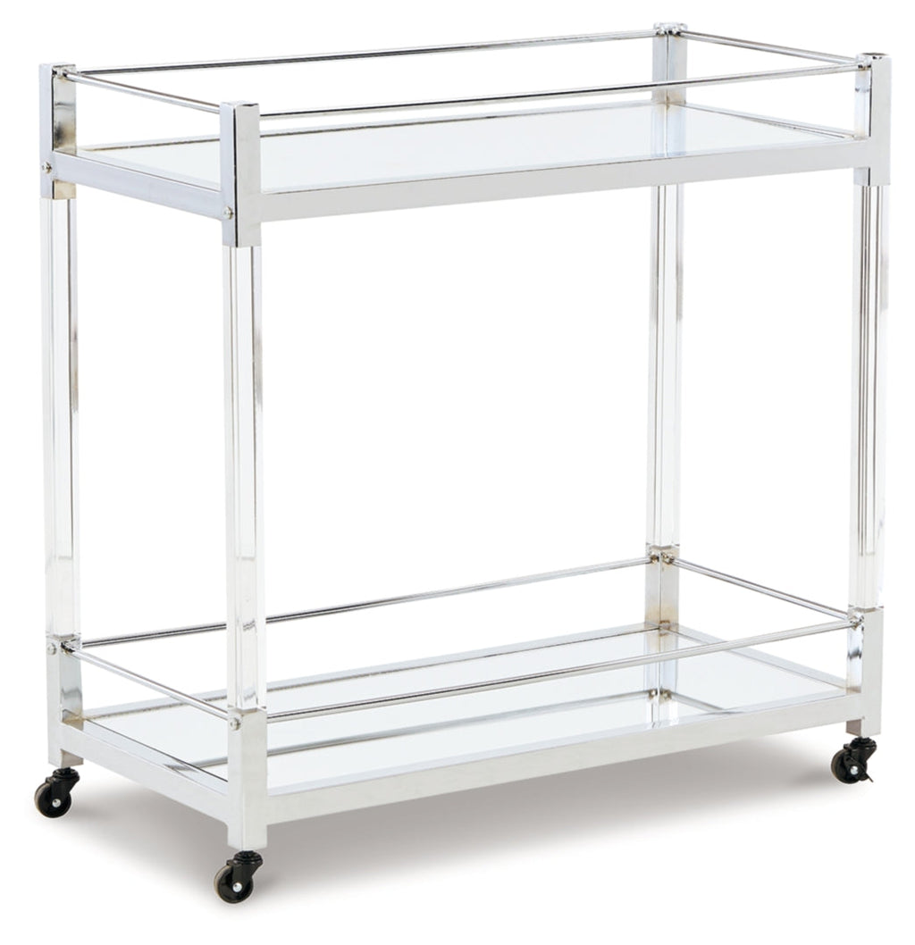 Reflect your love for contemporary style with this bar cart. With two shelves made with mirrored glass, it adds both light and a touch of glam to your space. A clear acrylic and chrome-tone frame is a modern take on understated elegance. And thanks to rolling casters, serving your guests has never been easier.