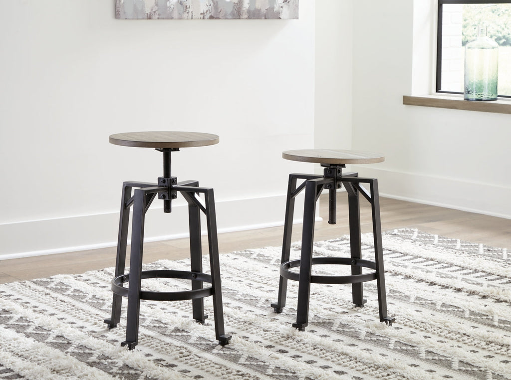 Delight in the effortless two-tone look of this swivel stool. Dark iron-tone metal and distressed brown wood pair for a rustic look with modern sensibility. The stool's adjustable height, swivel motion and footrest allow you to find your ideal comfort position.