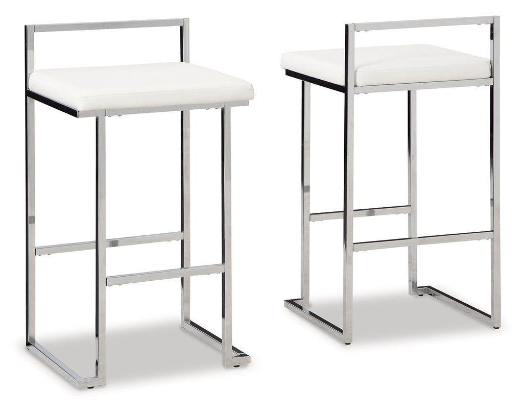 Wowing with a slim but sturdy profile and sculptural design, this bar stool is sure to whet your appetite for ultra-contemporary style. Its comfortably cushioned seat is covered in a fabulous white faux leather, while the metal frame’s chrome-tone finish provides visual contrast.