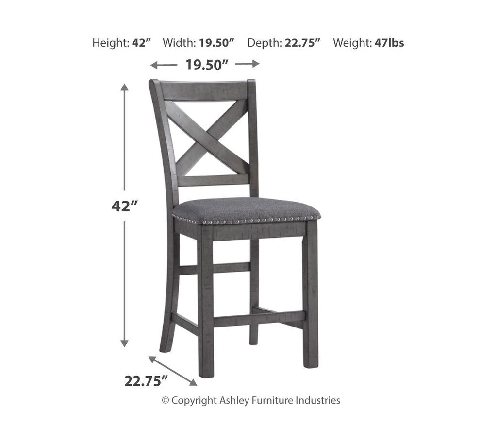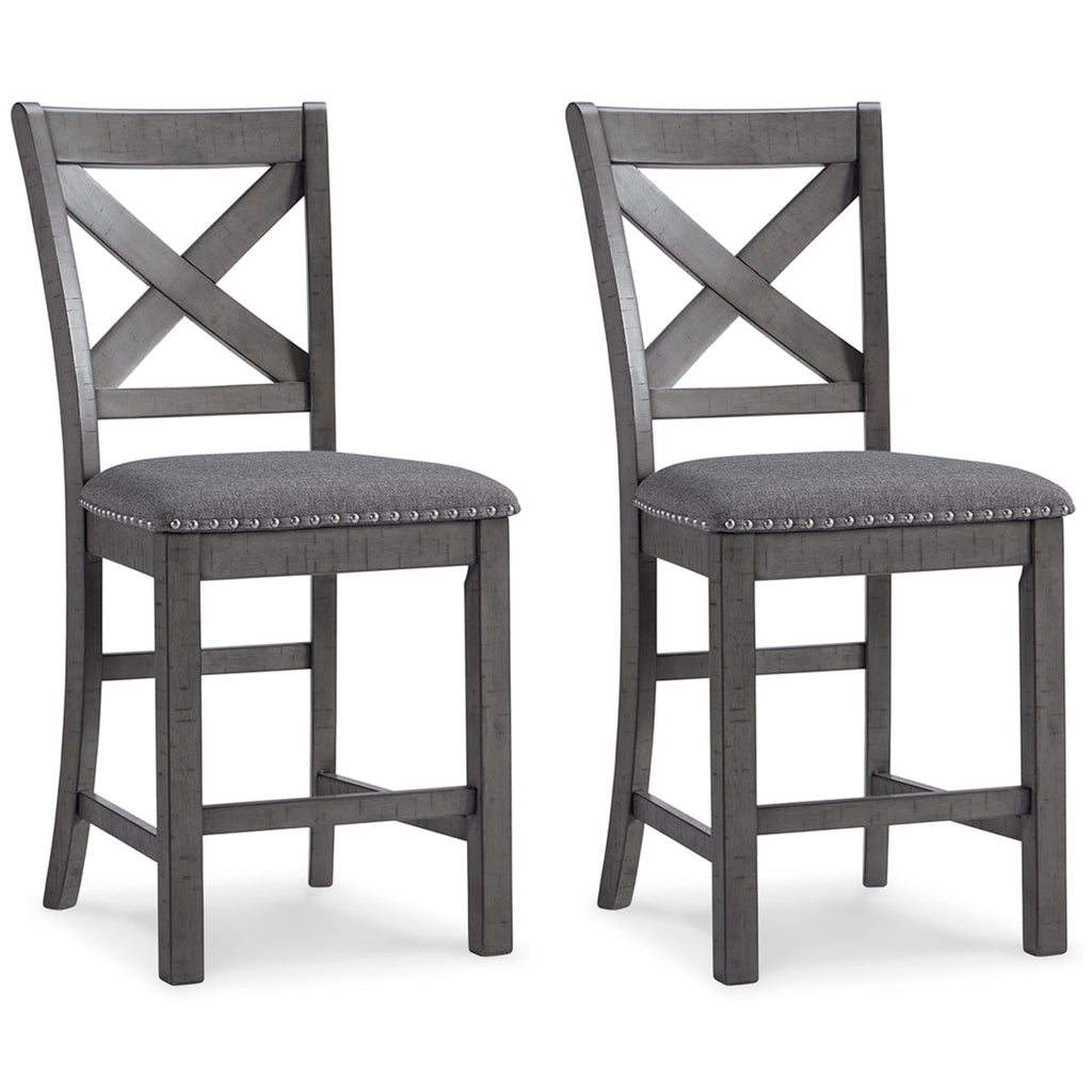 Going gray in the best possible way. This counter height bar stool package wows with an utterly on-trend smoky gray finish and X-back styling. Its softly cushioned seat with gray textured upholstery and nailhead trim will have you lingering a little longer at mealtime. Just a touch of distressing helps it fit right in with your modern farmhouse decor.