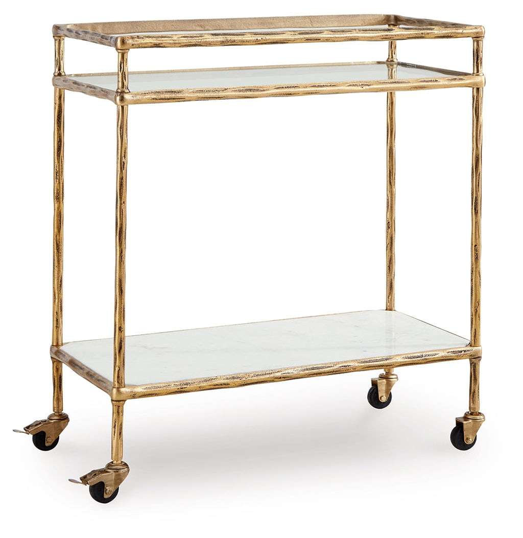 Store and serve in sleek style with this bar cart. Its casually cool design combines an antiqued brass-tone frame with white marble and clear glass. Rails on the top shelf help bottles and shakers stay organized. And with its rolling casters, you can make your at-home mini bar mobile and bring the party where your guests gather. It can also act as a cute coffee station—perfect for storing syrups, mugs and other must-haves for your morning brew.