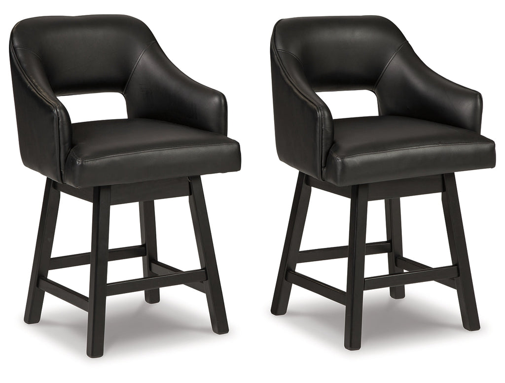 This striking barstool invites you to take contemporary modern style for a spin. Comfortably cushioned seat, self-returning swivel and contoured back make it beautifully in tune with your needs. Luxurious faux leather upholstery is a sensational touch.