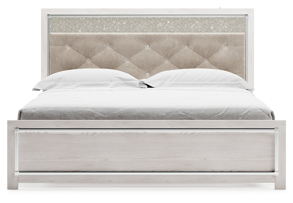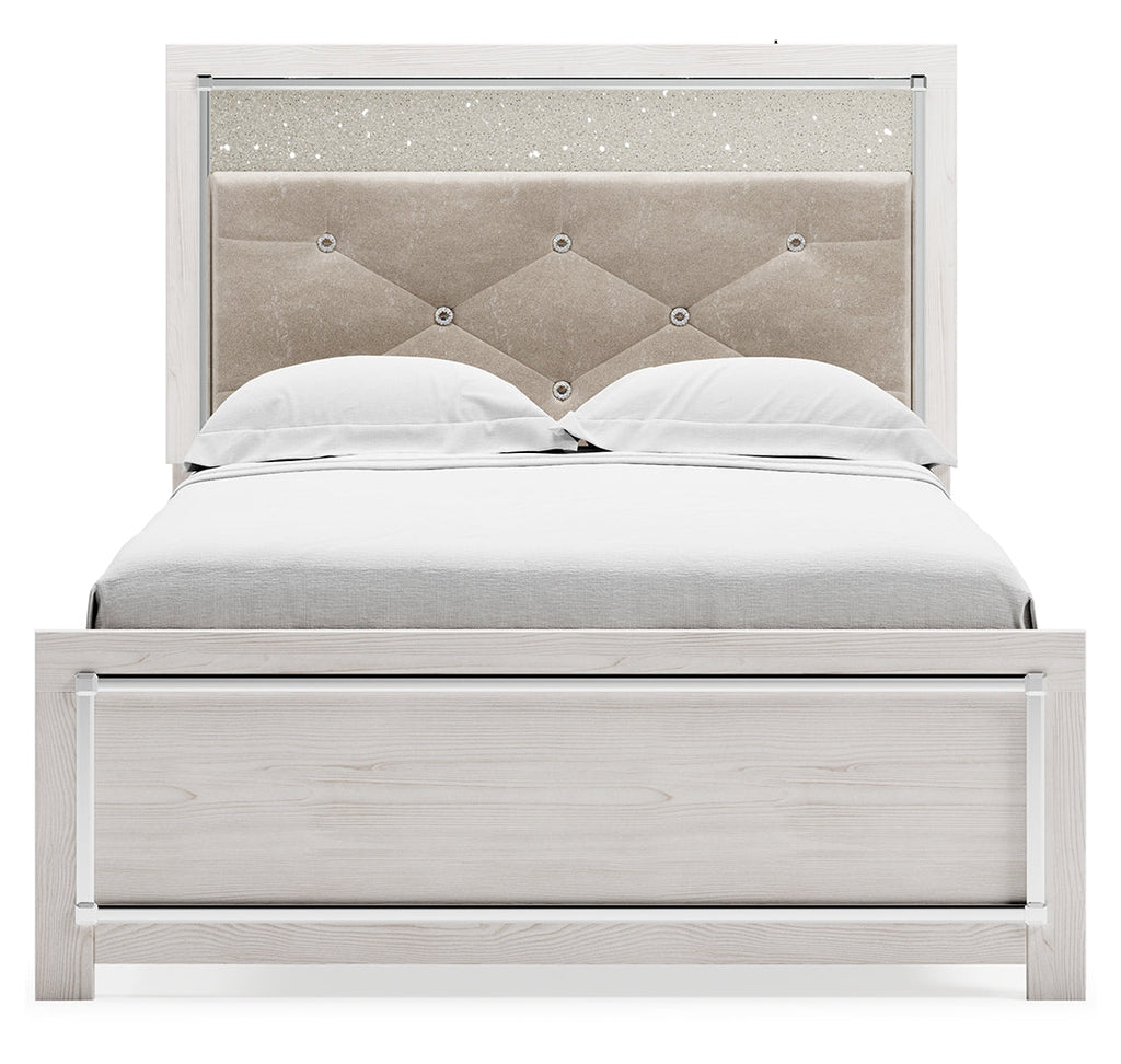 The epitome of fashion-forward design, this full panel bed is a beautiful blend of comfort and luxury. Shiny chrome-tone accents, a pearlized finish and button-tufted upholstery bring a glam touch to the richly rustic appearance. Remote-controlled LED lighting adds style and modern conveniences to your restful retreat.