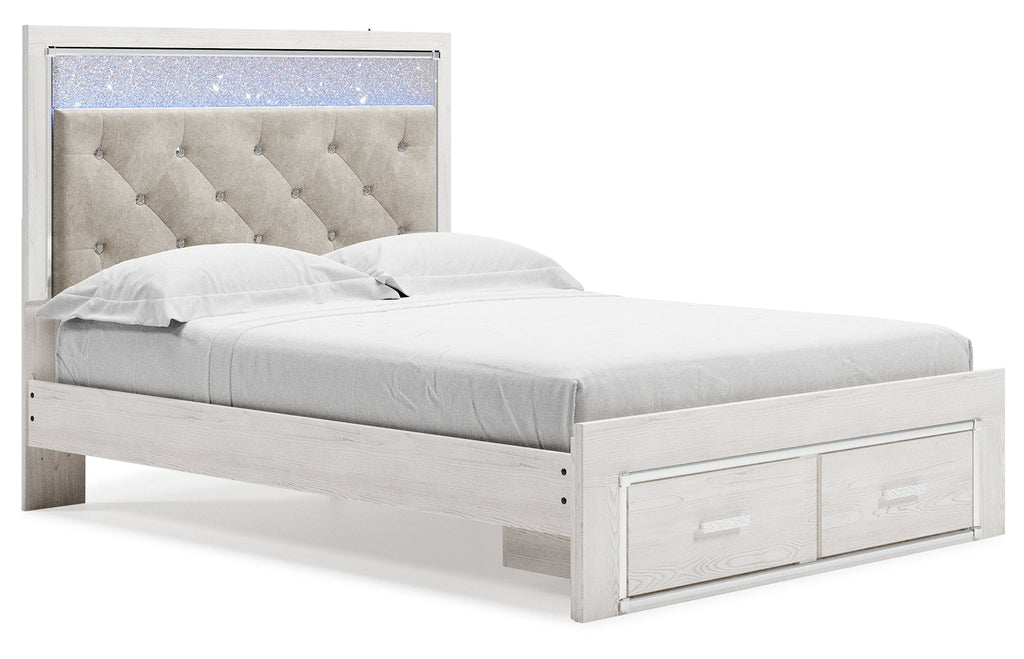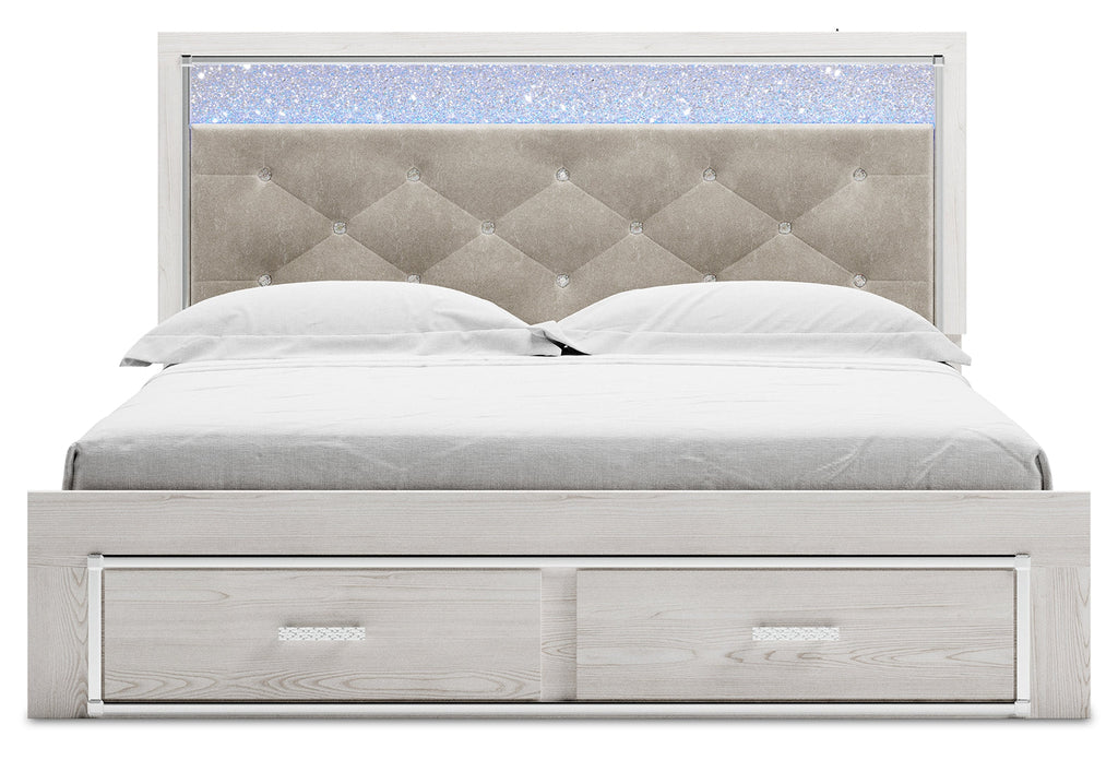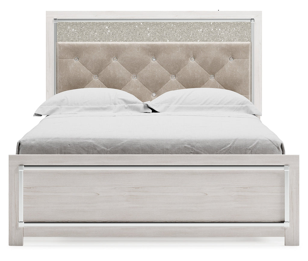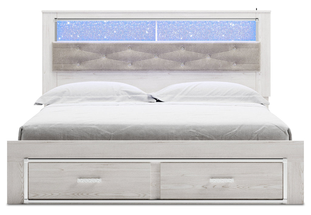 The epitome of fashion-forward design, this king upholstered bookcase bed is a beautiful blend of comfort and luxury. Shiny chrome-tone accents, a pearlized finish and button-tufted upholstery bring a glam touch to the richly rustic appearance. Remote-controlled LED lighting adds style and modern convenience to your restful retreat.