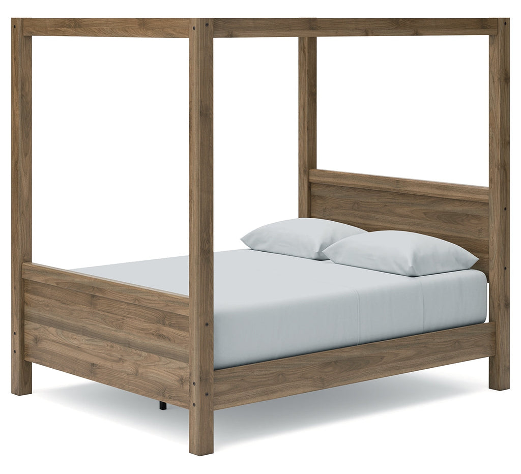 Dare to take minimalism to the max. This queen canopy bed has a richly relaxed feel thanks to its honey brown finish over replicated wood grain. The canopy posts take the bed's streamlined design to new heights, adding depth and dimension to your space. There's no doubt about it: This contemporary piece is sure to become a classic.