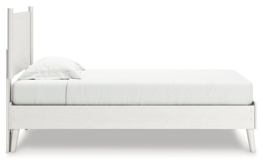 Dare to take minimalism to the max. This twin panel bed has an air of sleek simplicity thanks to its white painted finish with subtle replicated wood grain. The headboard's optional reversible cushion is an inventive element, allowing you to choose faux leather or gray fabric to suit your space. There's no doubt about it: This contemporary piece is sure to become a classic.