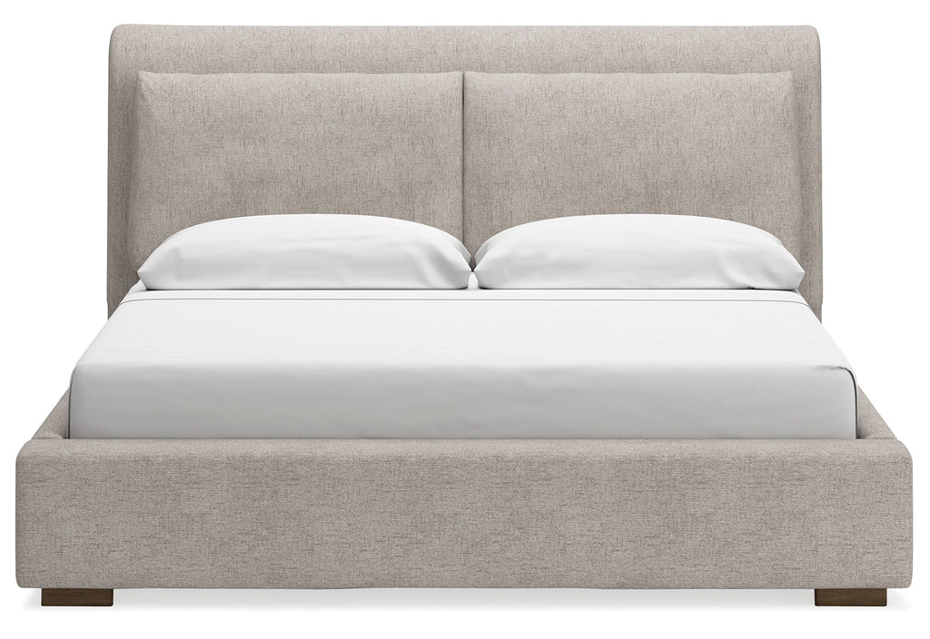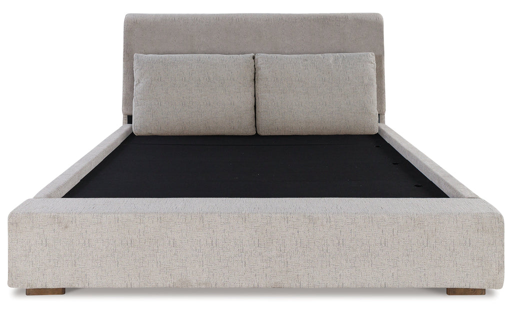 This California king upholstered bed sits comfortably at the intersection of modern lodge and farmhouse aesthetics. Your warm and welcoming disposition is reflected in its subtly tapered headboard and all-over upholstery. Even with its poise, the bed remains practical. Loose pillows on the headboard keep comfort a priority as you lay back to read or watch TV, defining your bedroom with reliable function and style.