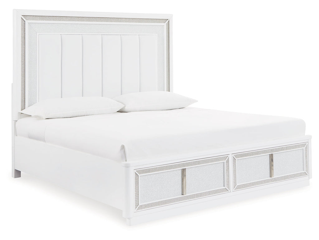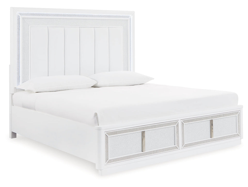 - Includes king/California king upholstered headboard, storage footboard, rails and roll slats
