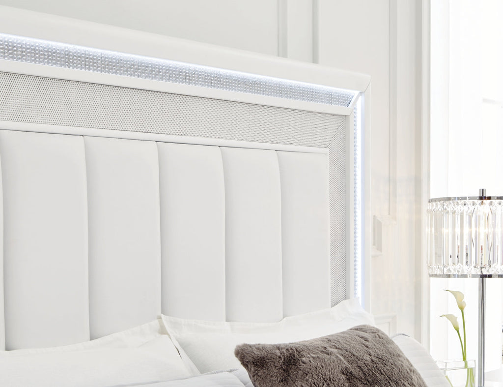 Transform your bedroom with this upholstered storage bed. With LED lighting, rhinestone framing and faux leather panels, this bed exudes modern glamour. And the convenient storage footboard offers a practical solution for organizing and accessing belongings. Let your sanctuary shine—and never let anyone dull your sparkle.