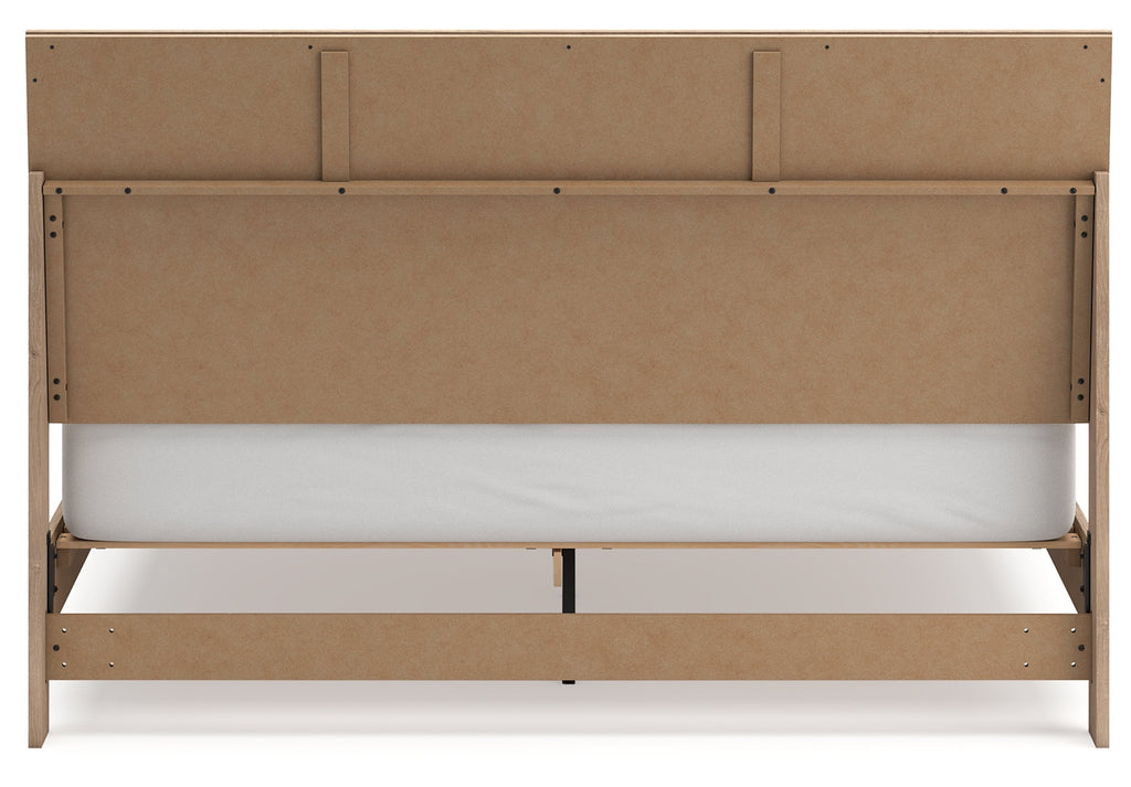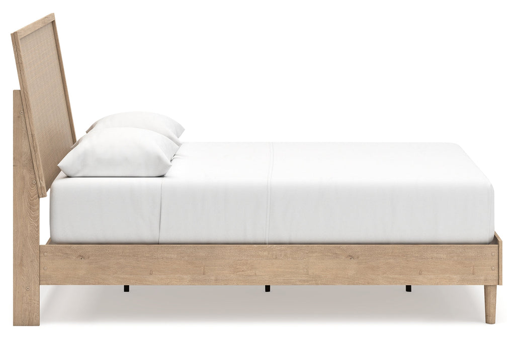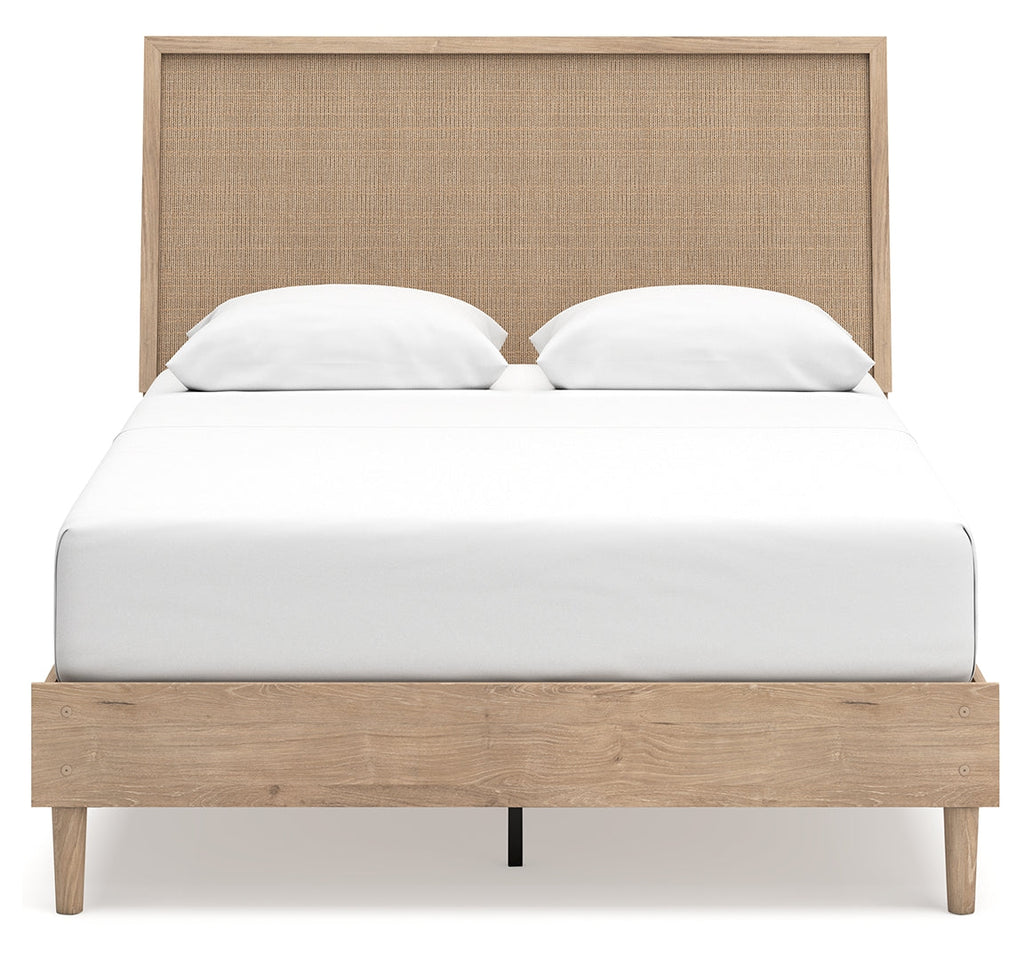 Clean-lined and contemporary—but far from stark—this full panel bed is a fresh style awakening. Pairing a light finish with replicated oak grain and textured beige cane details, its mixed materials bring a naturally versatile vibe to your bedroom. Talk about style with added dimension. The bed's simplicity plays perfectly with the modern aesthetic and is the stuff dreams are made of.